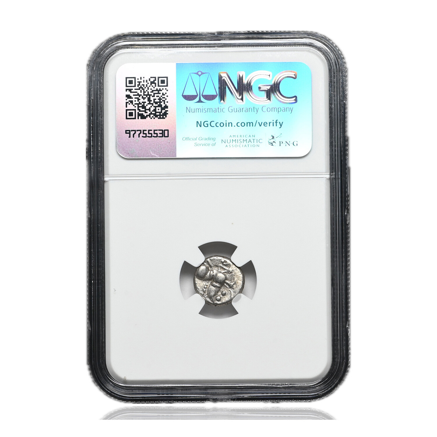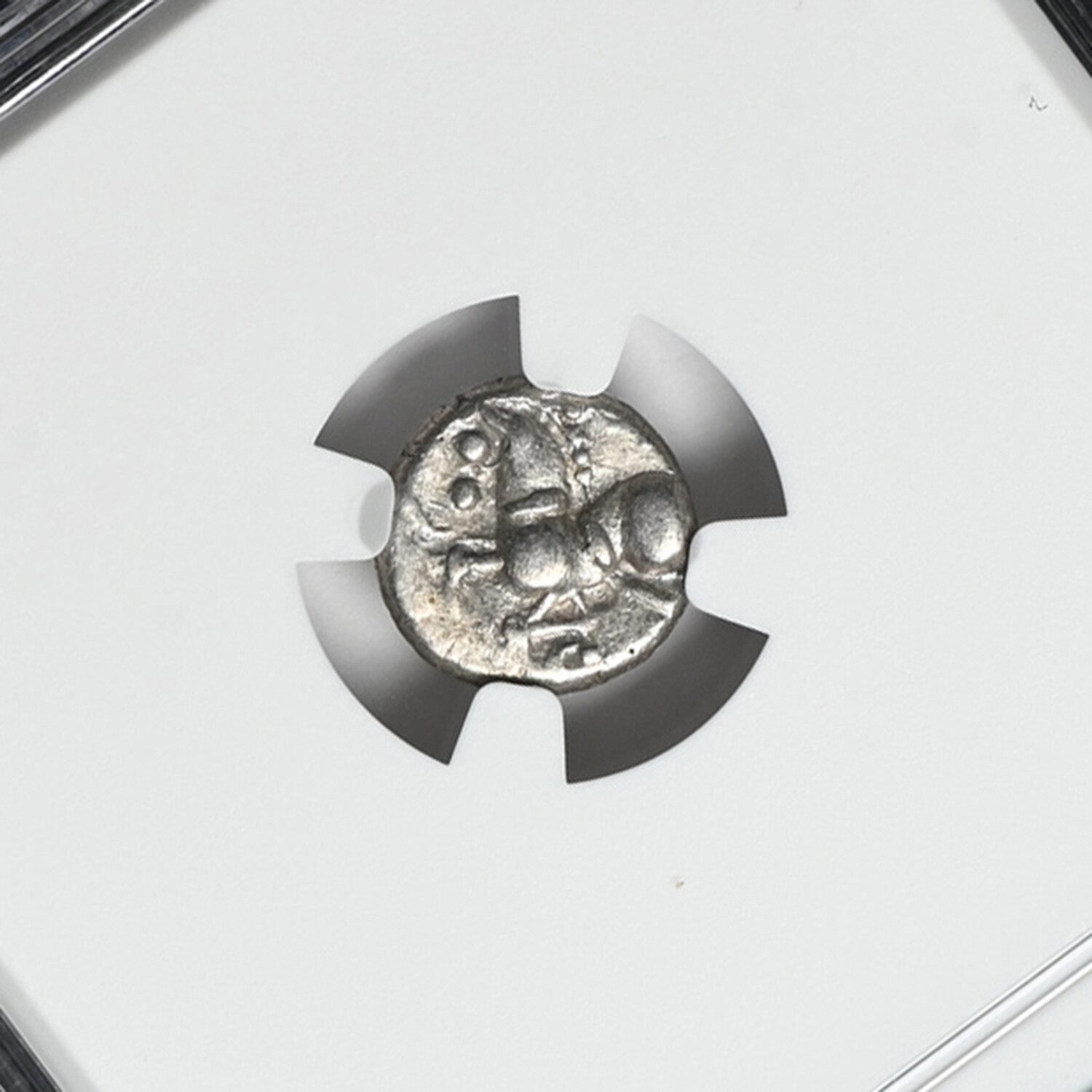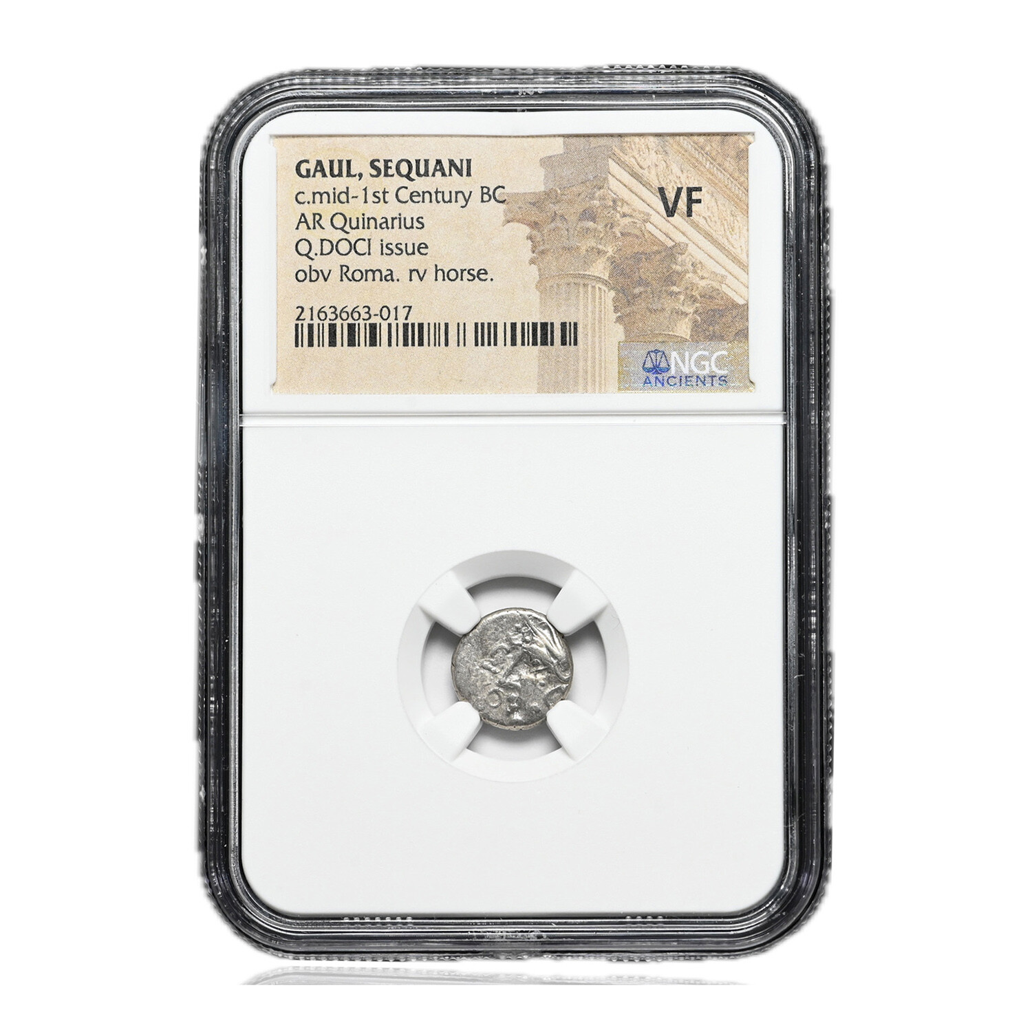 Ancient Celtic Gaul, mid 1st Century BC. A beautiful little silver Quinarius, struck by the Sequani tribe, Area of Besançon. The front depicts a helmeted Celtic head facing left, legend Q.DOCI to left / The back with a horse racing left, legend SAM.F around. ref: Delestrée 3245 for type. Nice detail for these. Coin diameter 11mm. Encapsulated and graded Very Fine by NGC! Archival slab measures 3.125" x 2.125" x 0.375”. Provenance: Ex De Père, WI collection.Accompanied by a hand-signed certificate of authenticity which includes all the details, culture, dating, motifs/inscriptions when applicable, historical relevance, and provenance.