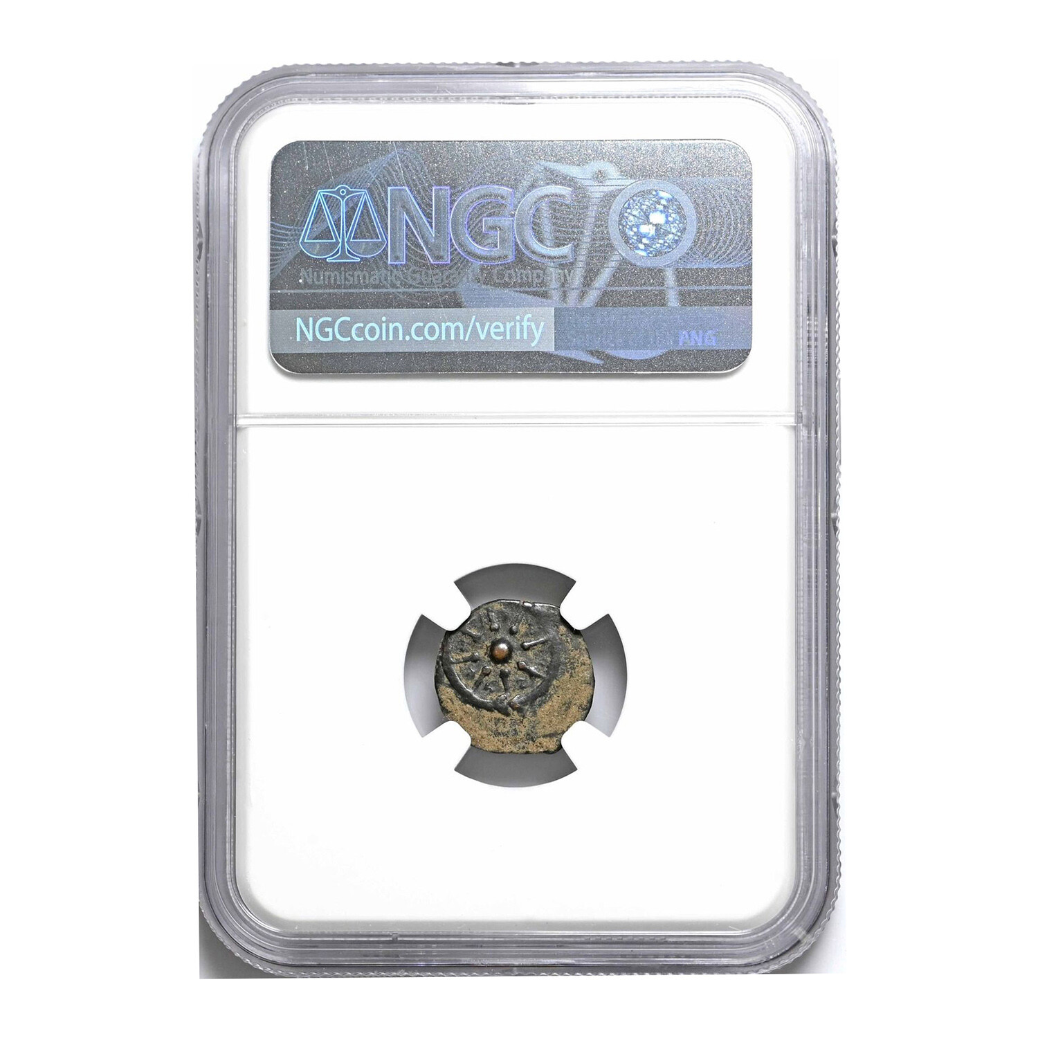Biblical "Poor Widow's Mite" coin. Bronze prutah, coin type mentioned in the Bible. Minted during the 1st Century BC but circulated throughout Judaea during the time of Christ. The coin depicts a wheel with 8 ray-like spokes, Hebrew inscription ”Yehonatan the King" on one side, and a Seleucid anchor, with Greek "BASILEWS ALEXANDPOY" on the other. ref: Hendin 1150 for type. Coin diameter 14 mm, with gorgeous detail and dark brassy tone. Encapsulated and graded Very Fine by NGC! Archival slab measures 3.125" x 2.125" x 0.375”. ** Referred-to in the Gospel of Luke 21:1-4... "And he looked up, and saw the rich men casting their gifts into the treasury. And he saw also a certain poor widow casting in thither two mites. And he said, Of a truth I say unto you, that this poor widow hath cast in more than they all: For all these have of their abundance cast in unto the offerings of God: but she of her penury hath cast in all the living that she had."Accompanied by a hand-signed certificate of authenticity which includes all the details, culture, dating, motifs/inscriptions when applicable, historical relevance, and provenance.