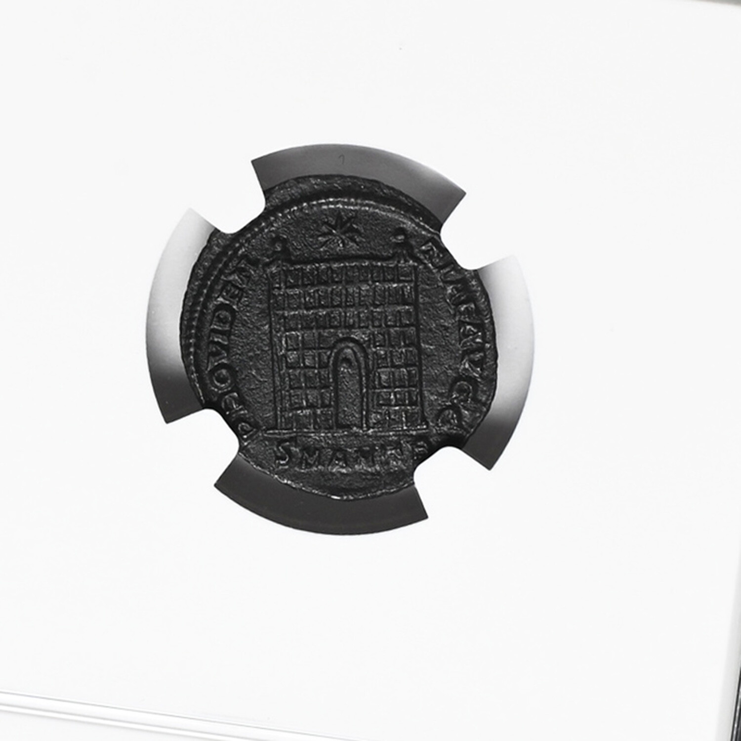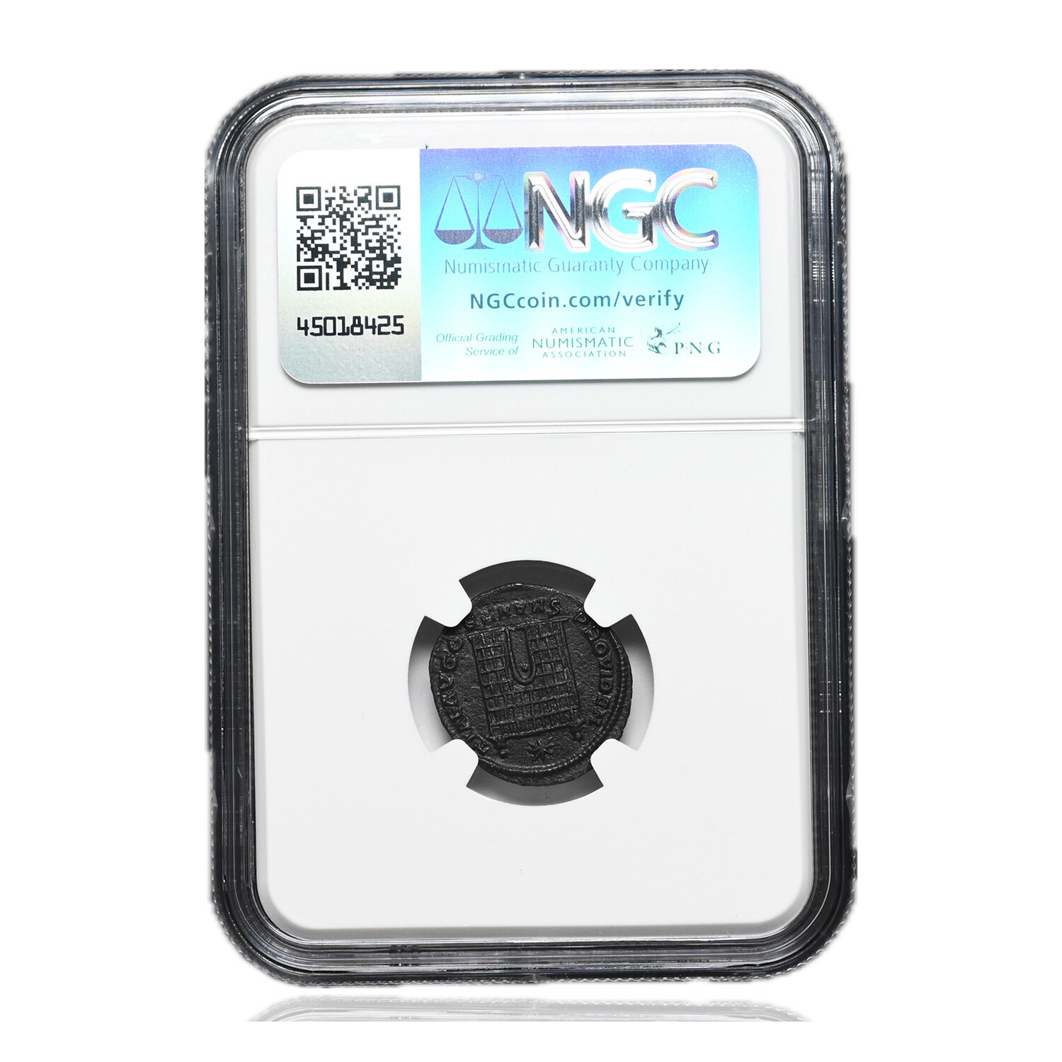 Ancient Rome. Constantine I the Great, 307-337 AD. Bronze nummus, struck 325-326 AD, graded Extremely Fine by NGC! The front depicts the laureate head of Constantine facing right, Latin inscription CONSTANTINVS AVG around / The back depicts a Roman castle camp-gate with two turrets and a star above, Latin inscription PROVIDENTIAE AVGG; Mintmark: SMANT = Antioch mint below. Deep coppery to black patina, choice detail! Reference: RIC VII 461 for type. Coin diameter 19 mm, slabbed and graded Extremely Fine by NGC! Archival slab measures 3.125" x 2.125" x 0.375”. Provenance: Ex De Père, WI collection.Accompanied by a hand-signed certificate of authenticity which includes all the details, culture, dating, motifs/inscriptions when applicable, historical relevance, and provenance.