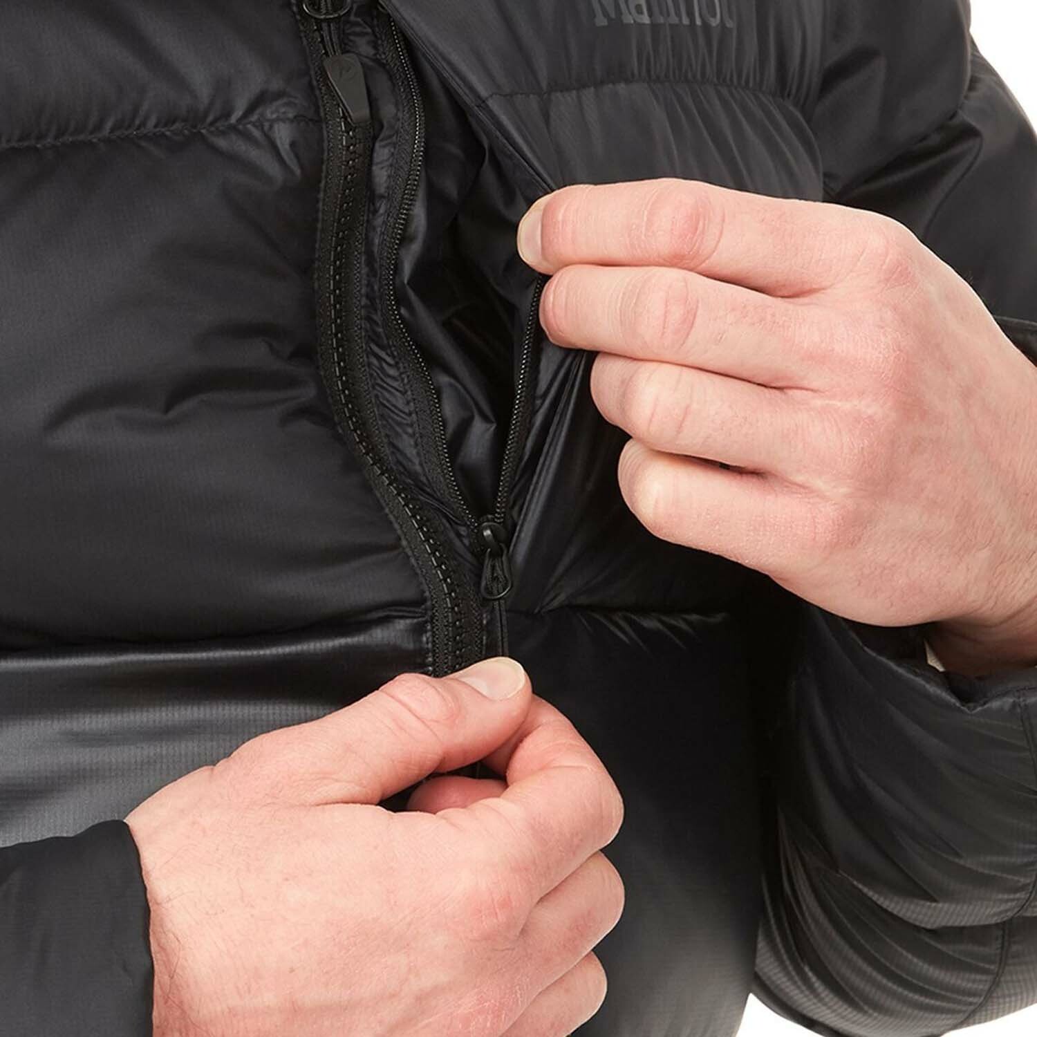 Why We Like The Guides Down Hooded Jacket, The Marmot Guides Down Hooded Jacket warms up cold campsites, crags, and the ski resort's parking lot when we're getting in and out of our boots. Its 700-fill down insulation ensures warmth without weight, and the Down Defender treatment helps the insulation retain its loft so we stay warm if it gets wet. Polyester ripstop wraps up this wonderful warmth with durability that won't let feathers poke out. Both the interior and exterior have a water-resistant coating to keep you doubly protected against wet weather. Material: [face fabric] 100% polyester ripstop, [lining] 100% embossed polyester Insulation: 700-fill power down Fit: regular Length: hip Center Back Length: 29.5in Hood: adjustable Pockets: 2 zippered handwarmer, 1 zippered chest, 1 interior chest Claimed Weight: 1lb 7oz Activity: casual, hiking, skiing, snowboarding Manufacturer Warranty: lifetime