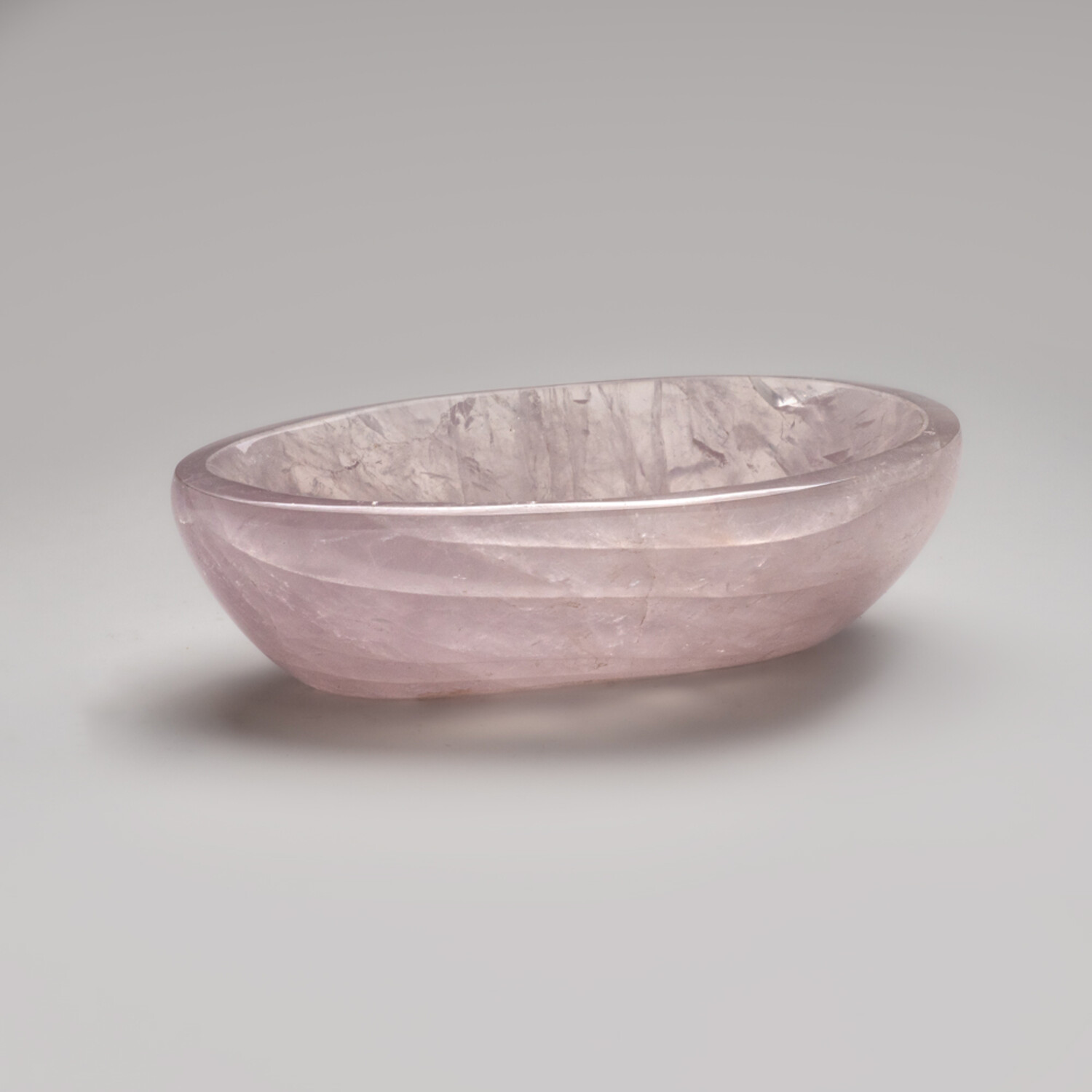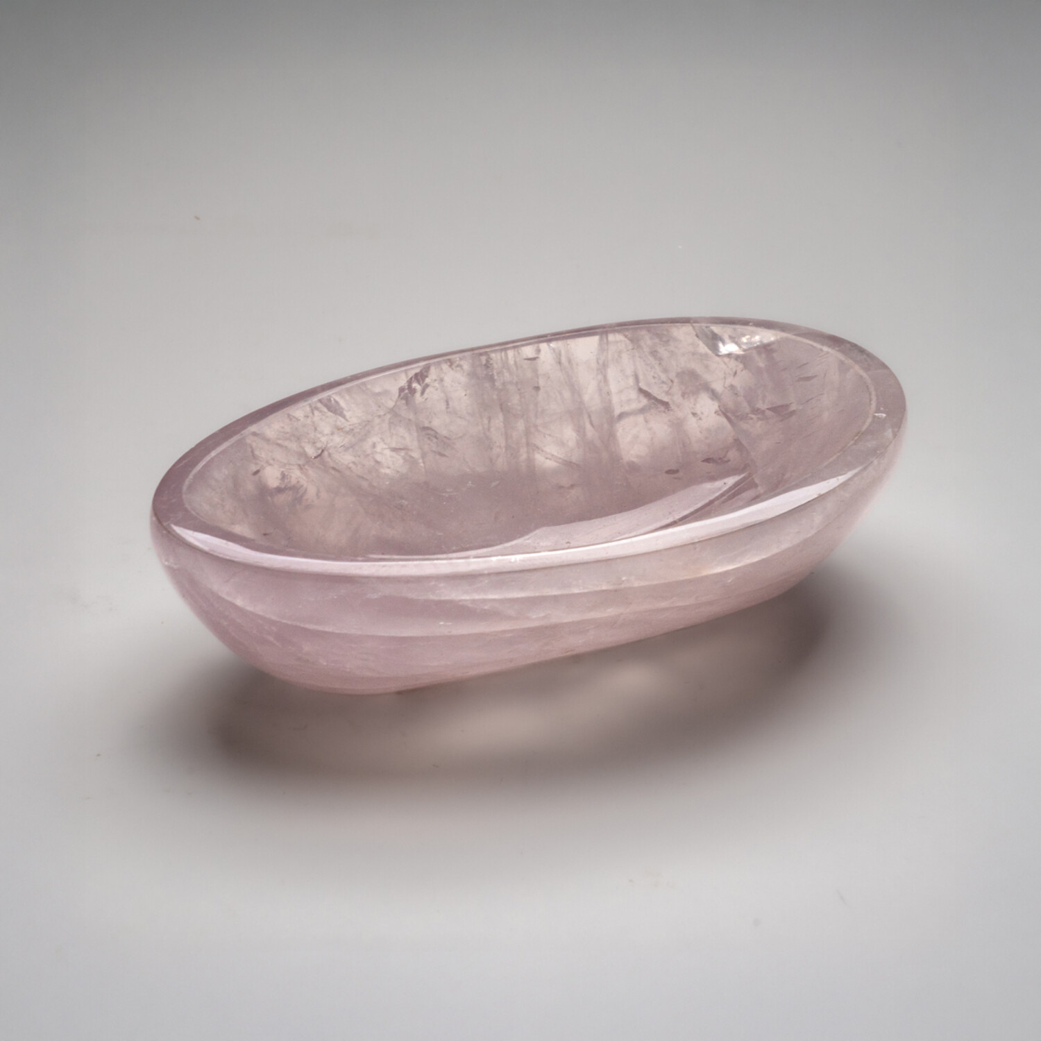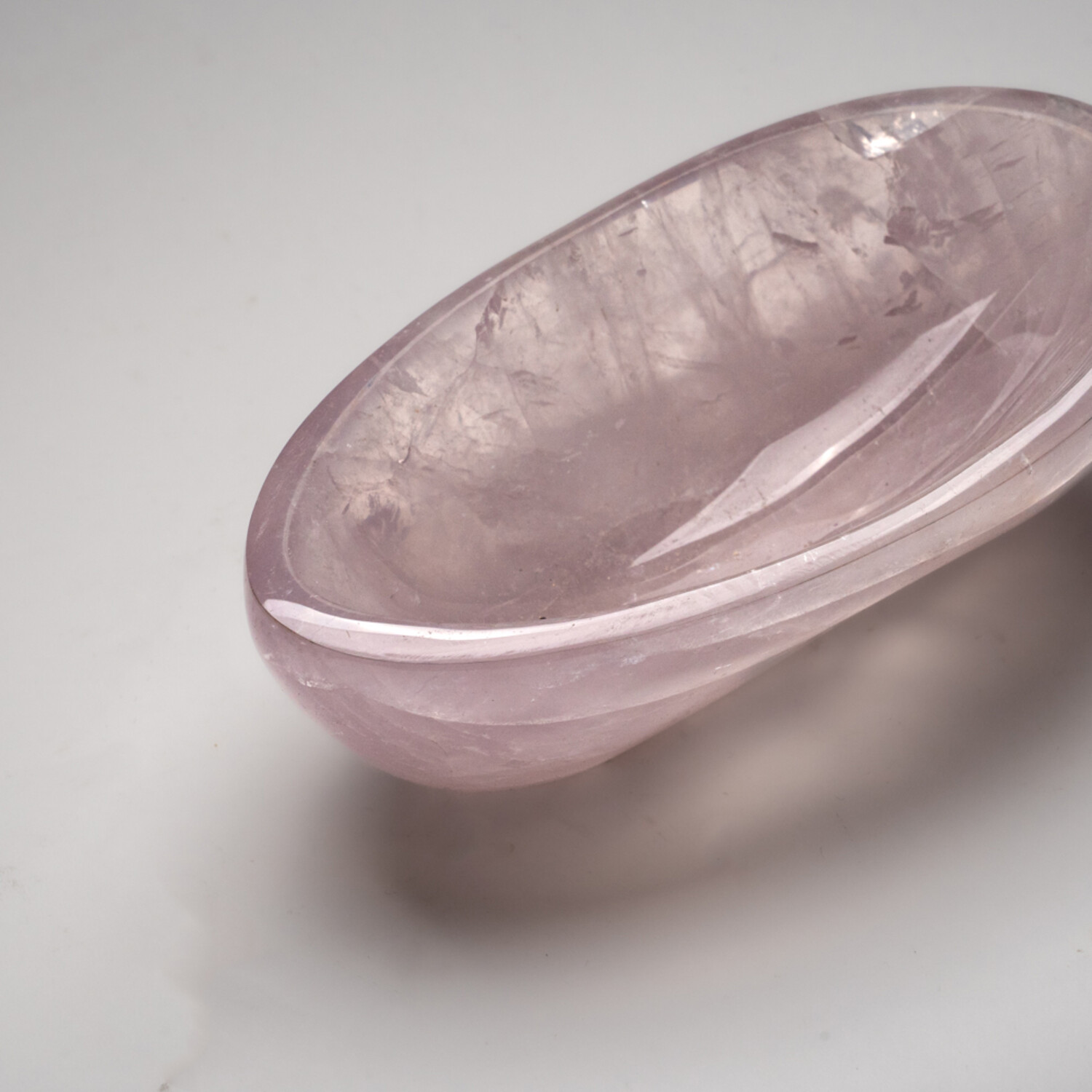 Handmade polished free-form bowl of natural gem translucent rose quartz from Brazil. All sides hand polished to a smooth mirror finish. This will make a beautiful centerpiece to complement your home.