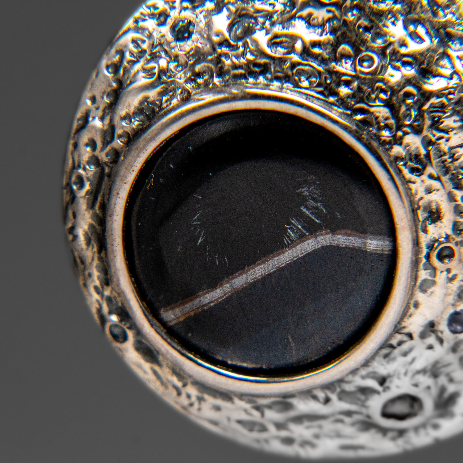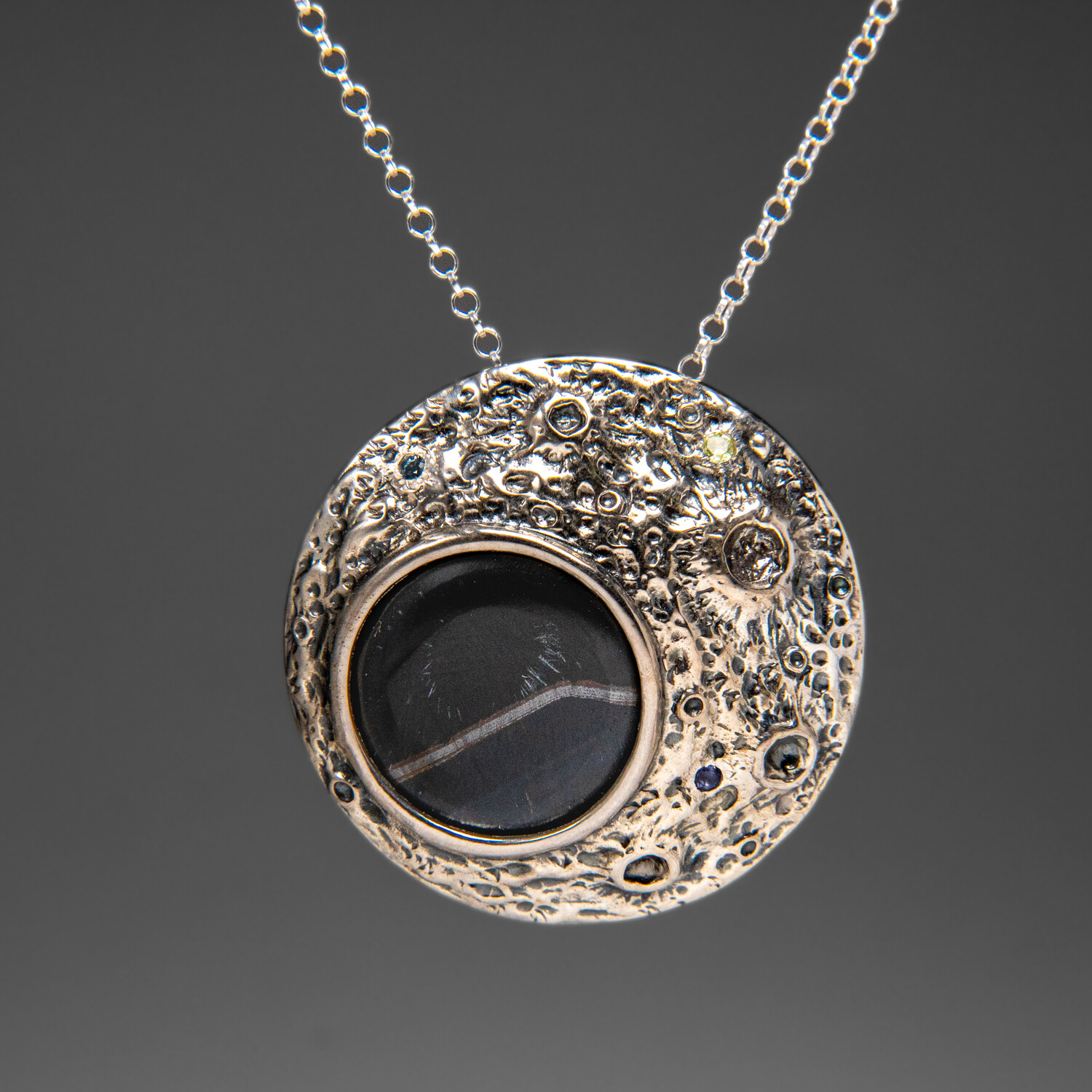 A handcrafted sterling silver pendant showcasing a crescent moon accented with polished black onyx. The deep, glossy stone adds grounding presence and quiet elegance, creating a refined piece that balances mystery, clarity, and thoughtful style.--Weight:21.5 g