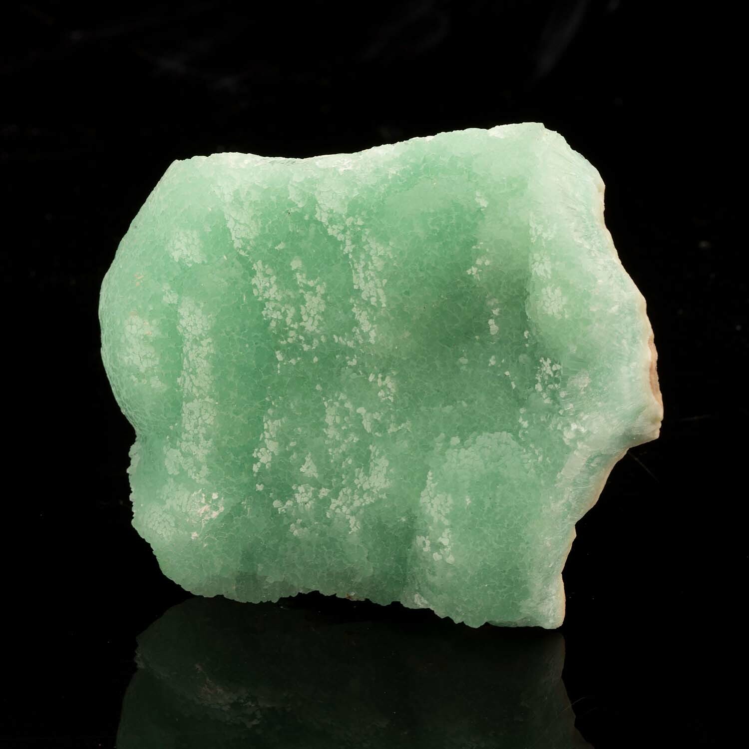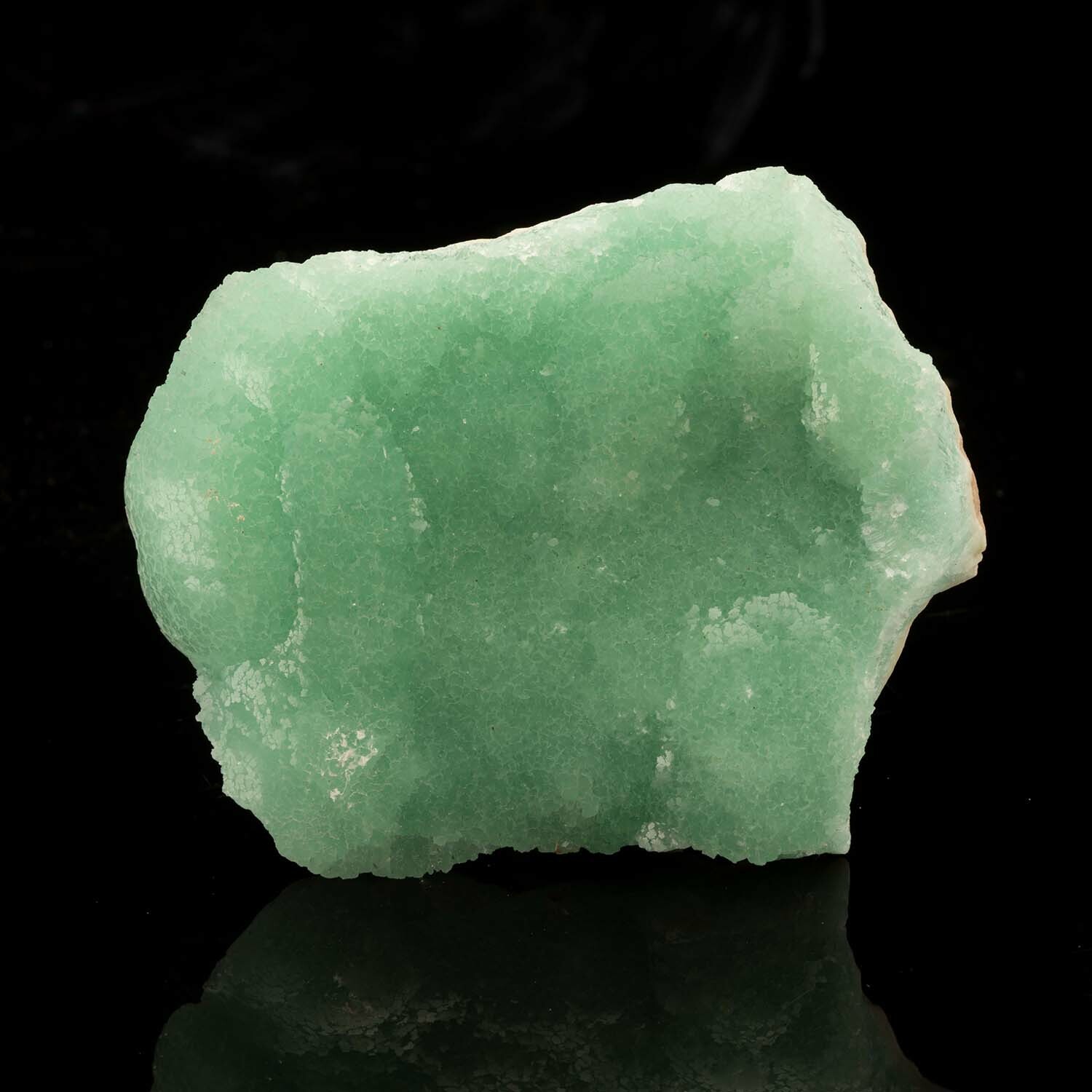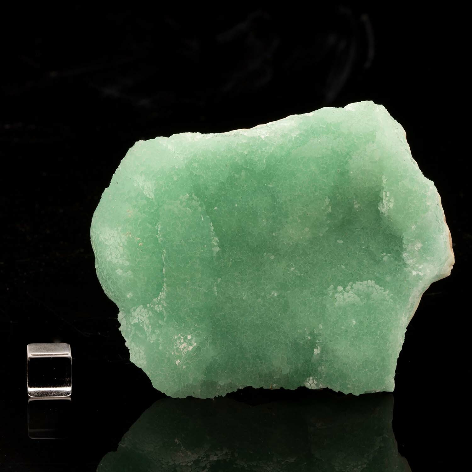 This lovely delicately hued teal specimen is a special find perfect for the discerning mineral enthusiast. Green is a very sought-after color of aragonite along with the crystallized blue and it's unusual to find pieces of this calcium carbonate mineral with such spectacular luster and botryoidal crystal formation. This crystal comes from a pocket very recently discovered in Afghanistan and displays a sparkling effect from all angles. The cube in the picture is approximately one centimeter.