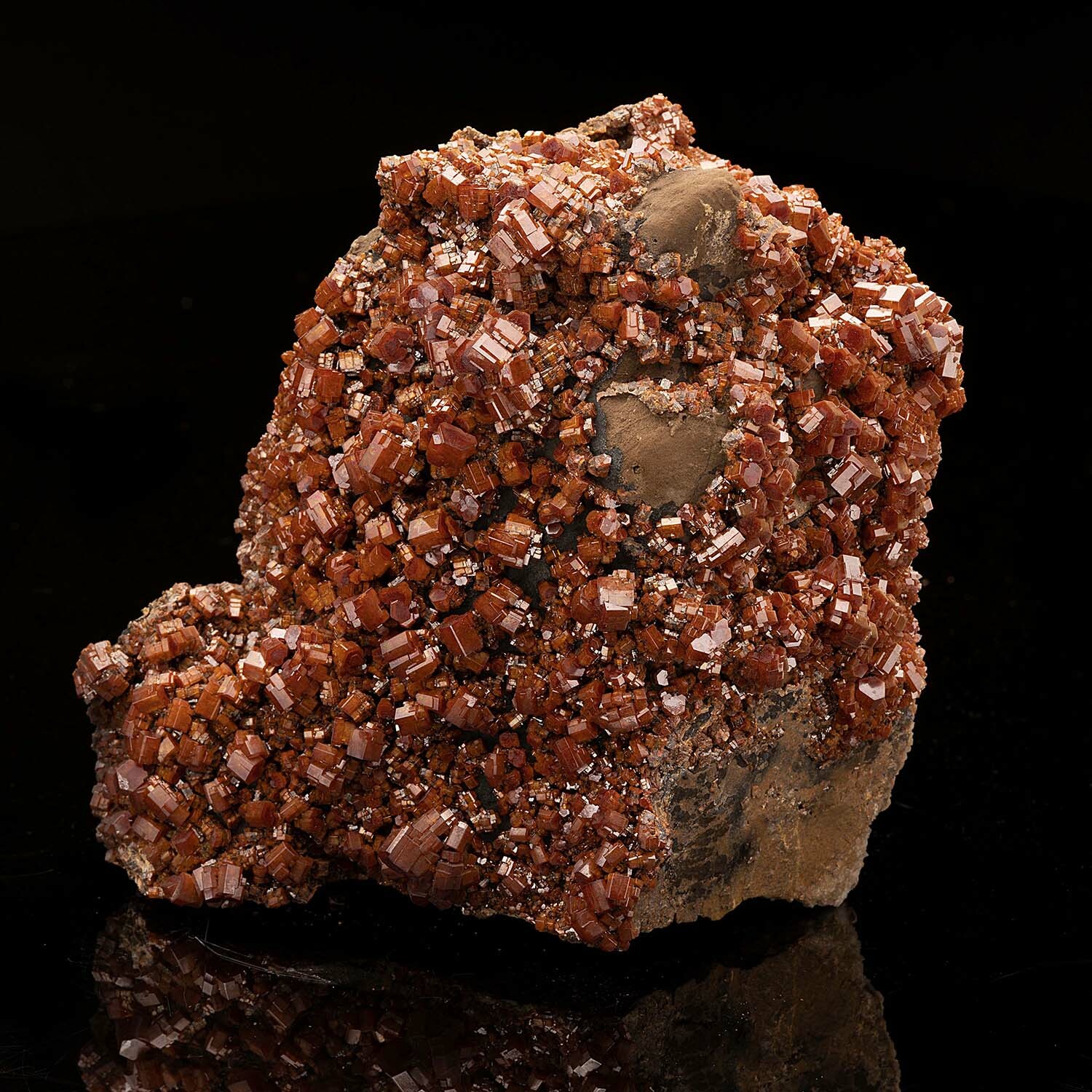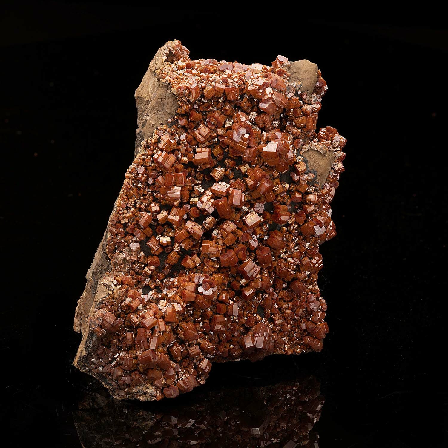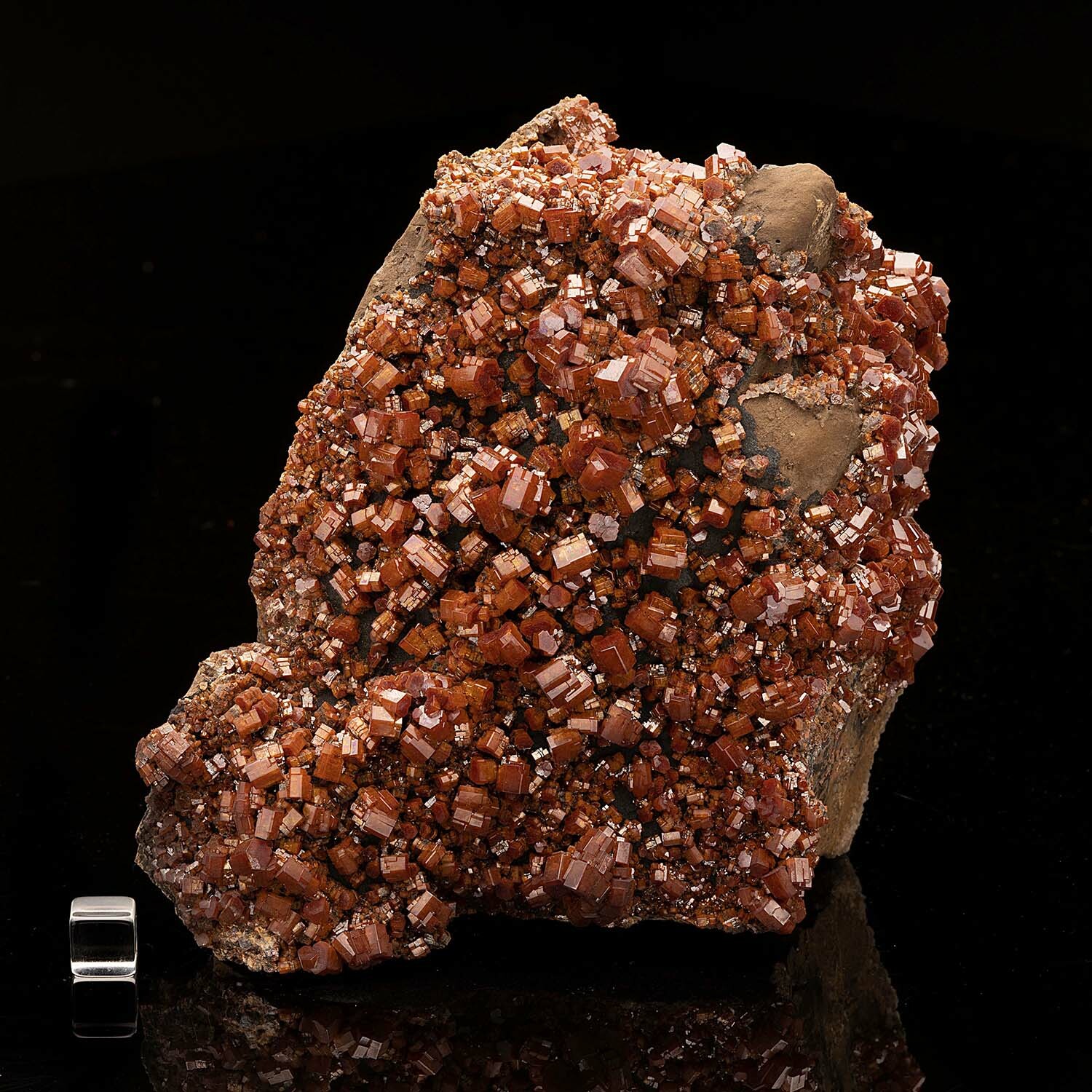 This cabinet-size specimen boasts a lush and lustrous coating of reddish-orange hexagonal vanadinite crystals on the face and side of a rocky brown matrix. Many of these crystals are well-sized and extremely well-defined and this piece is a treasure trove of perfect terminations. A standout acquisition to add fascination your fine minerals collection. The cube in the picture is approximately one centimeter.