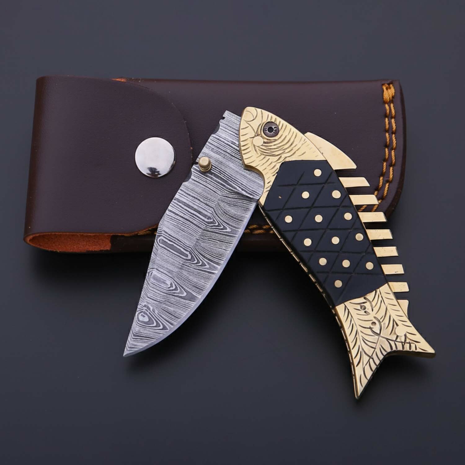 Damascus Folding Knife // Black Micarta & Brass // Fish