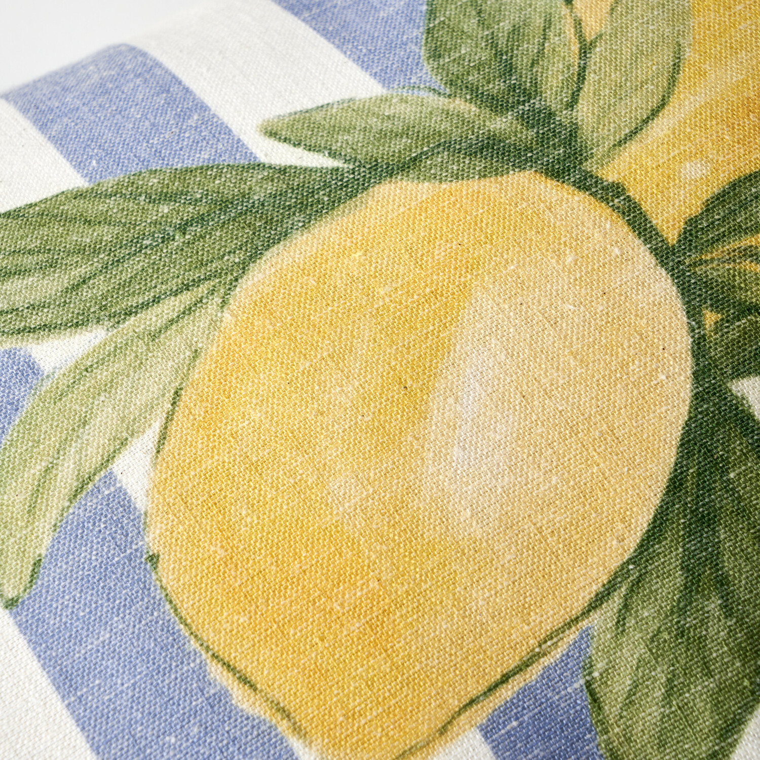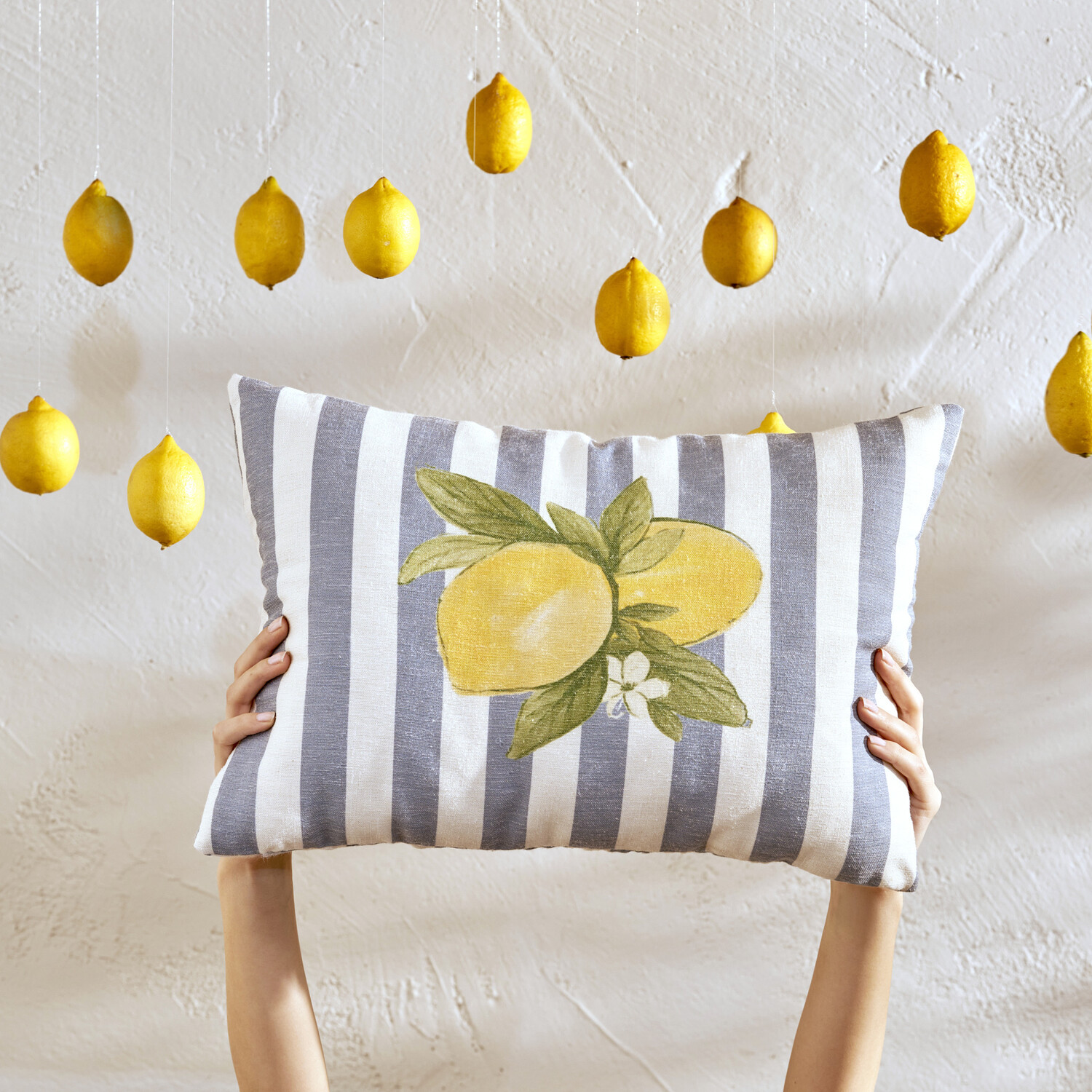 Blue cushion cover with cream punch embroidery from the Lemoncello Collection, inspired by the freshness of lemon gardens and Amalfi charm.