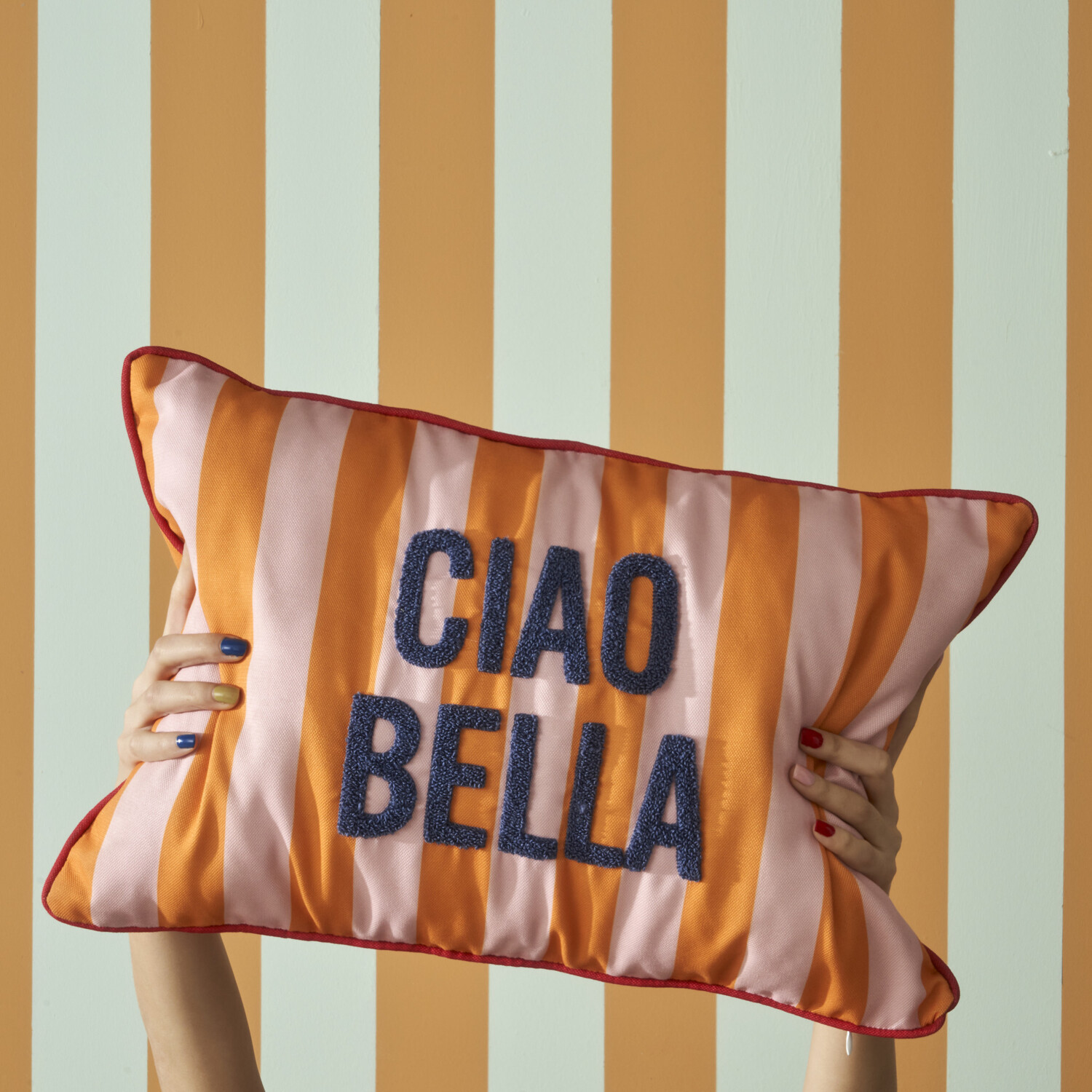 Red and orange punch embroidered cushion cover with “Ciao Bella” motto from the Line Collection, bringing a bold and stylish accent to any space.