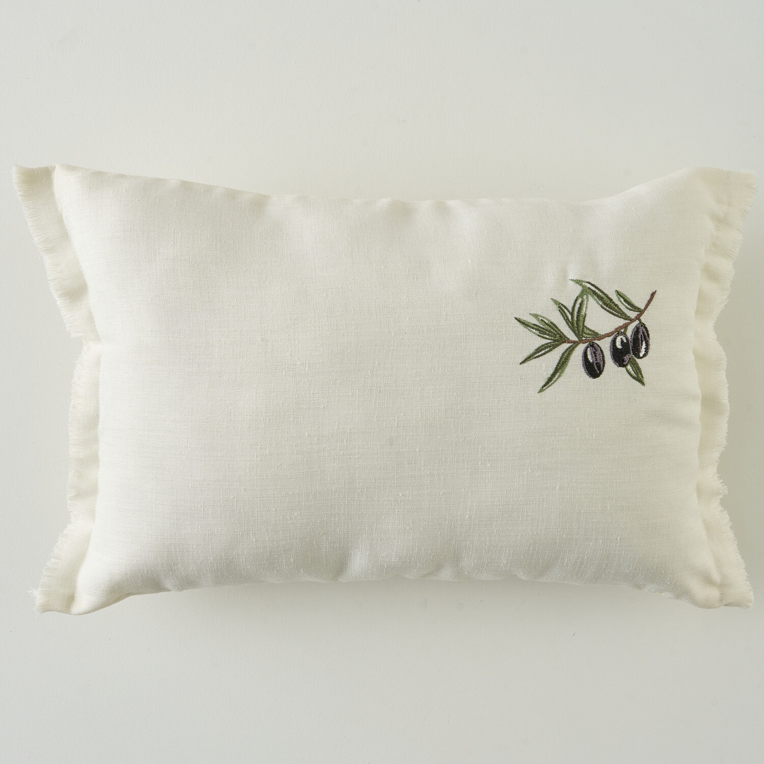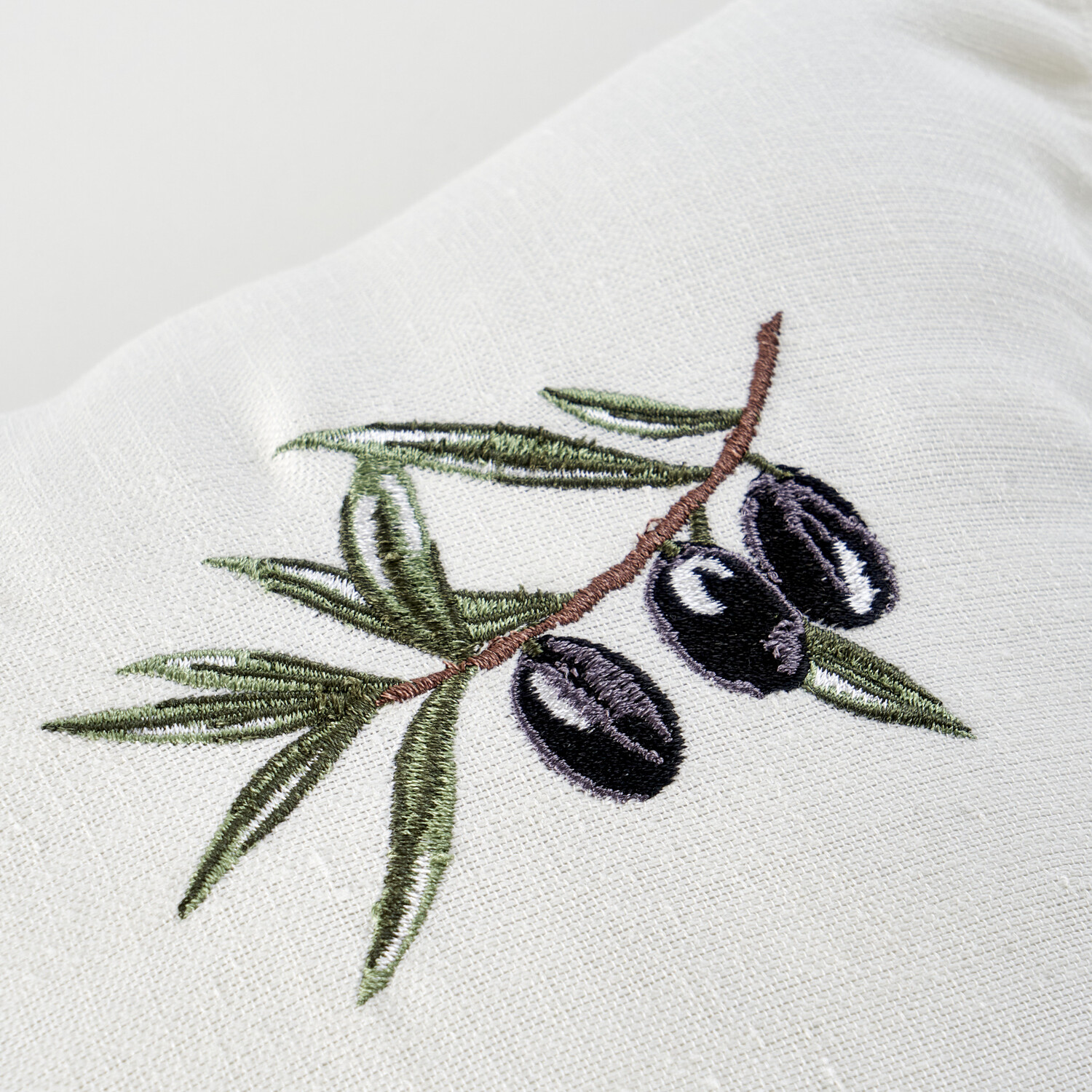 Beige cushion cover with elegant olive branch embroidery from the Olive Collection, adding natural charm and tranquility to your space.