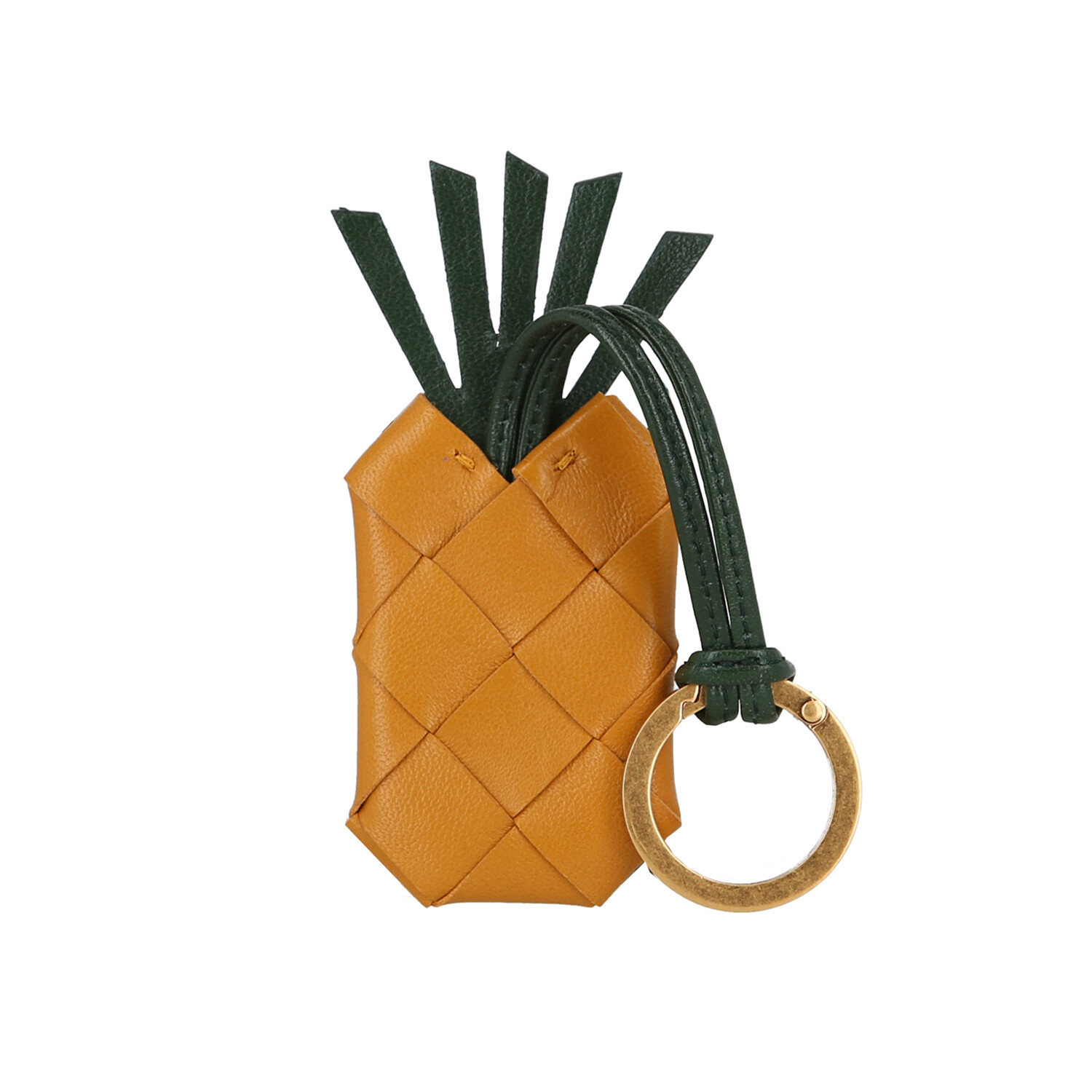 — Mustard Yellow Texture "pineapple" Design With Green Leather "leaf" — Push Clasp Key Ring