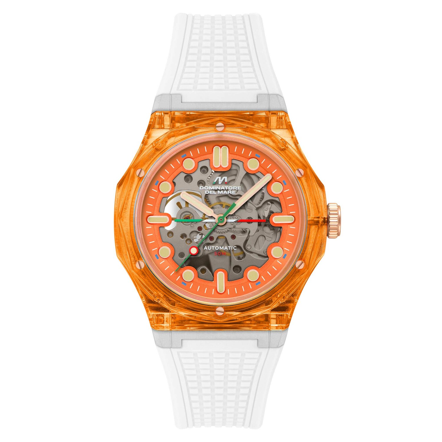 COLLECTION: RAVELLO MODEL: DD-8029-03 MOVEMENT: AUTOMATIC CASE MATERIAL: PLASTIC/SS CASE DIAMETER (MM): 45 CASE THICKNESS (MM): 13 CASE SHAPE: ROUND CASE COLOR: ORANGE DIAL COLOR: ORANGE BAND: SILICONE STRAP BAND COLOR: WHITE BUCKLE: STRAP BUCKLE BAND WIDTH (MM): 20 WATER RESISTANCE: 5 ATM WATCH WEIGHT (G): 90 WARRANTY: 2 YEARS