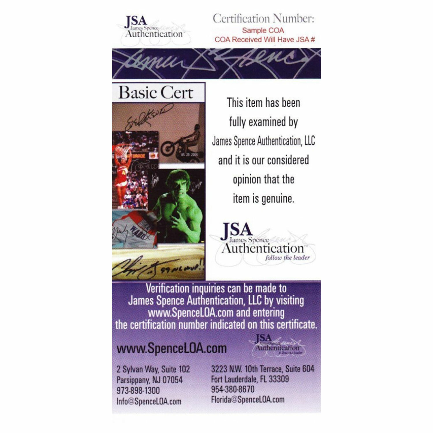 Every autograph is independently examined and certified genuine by James Spence Authentication (JSA). JSA is one of the most trusted and reputable authenticators in the industry. Each piece includes a tamper-proof JSA sticker and a matching Certificate of Authenticity (COA). Your certificate number can be verified anytime through JSA’s online database, ensuring the piece is authentic, traceable, and protected.