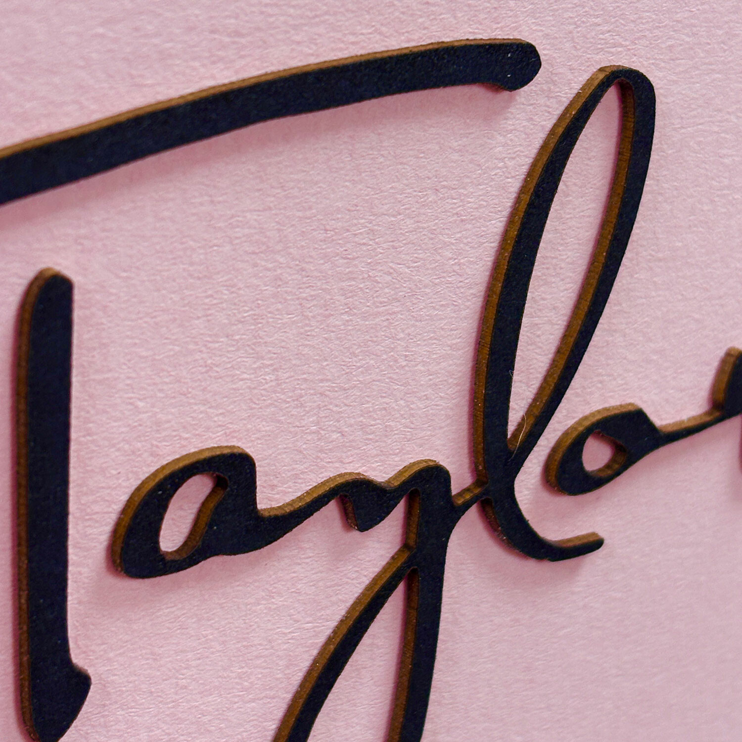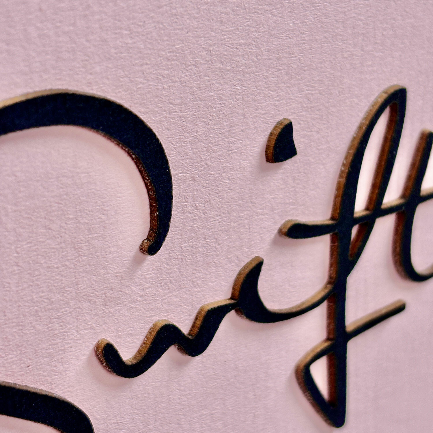 — Double matting with a pink top mat and 3D laser-cut lettering in the font from her debut album as a nod to her roots.