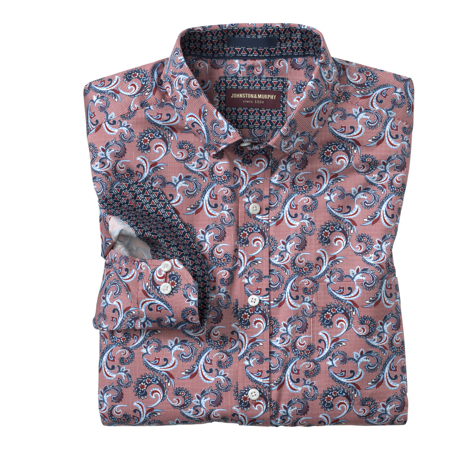 - Sateen finished printed cotton with spandex to add comfort. - Contrast facing inside collar and cuffs. - Hidden button-down collar construction. - Chest pocket. - Shirttail hem. - 97% Cotton/ 3% Spandex. - Machine wash. - Imported.