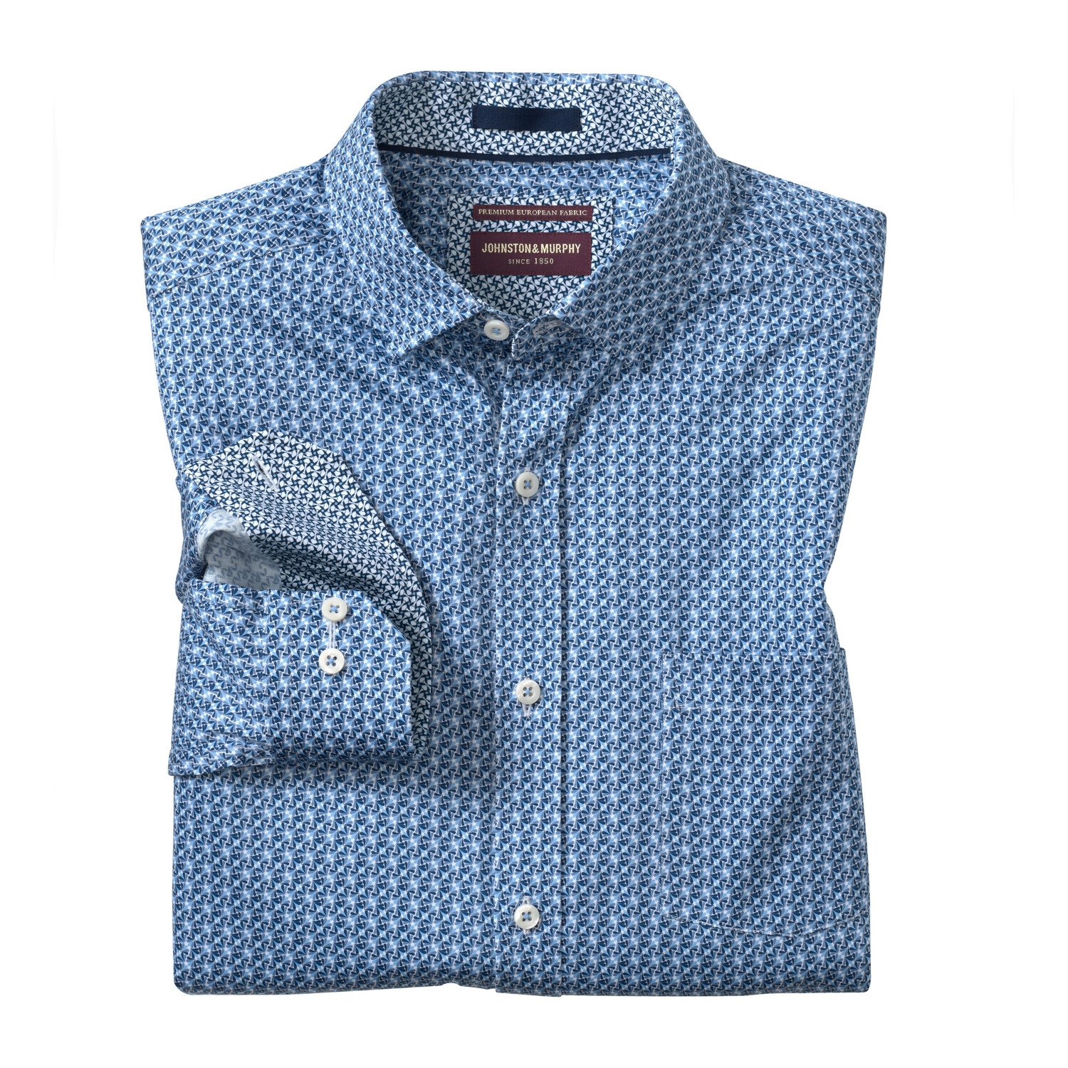 - Sateen finished printed cotton with spandex to add comfort. - Contrast facing inside collar and cuffs. - Hidden button-down collar construction. - Chest pocket. - Shirttail hem. - 97% Cotton/ 3% Spandex. - Machine wash. - Imported.