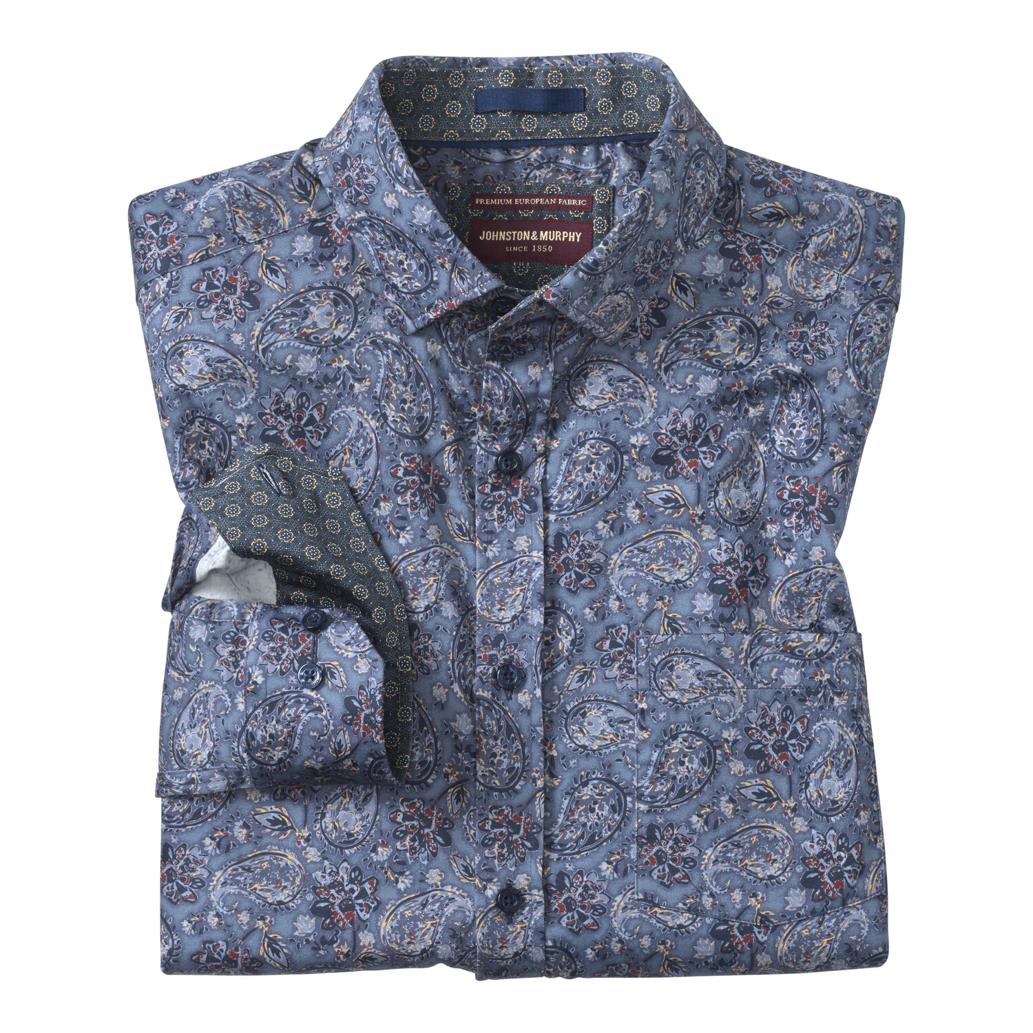 - Sateen finished printed cotton with spandex to add comfort. - Contrast facing inside collar and cuffs. - Hidden button-down collar construction. - Chest pocket. - Shirttail hem. - 97% Cotton/ 3% Spandex. - Machine wash. - Imported.
