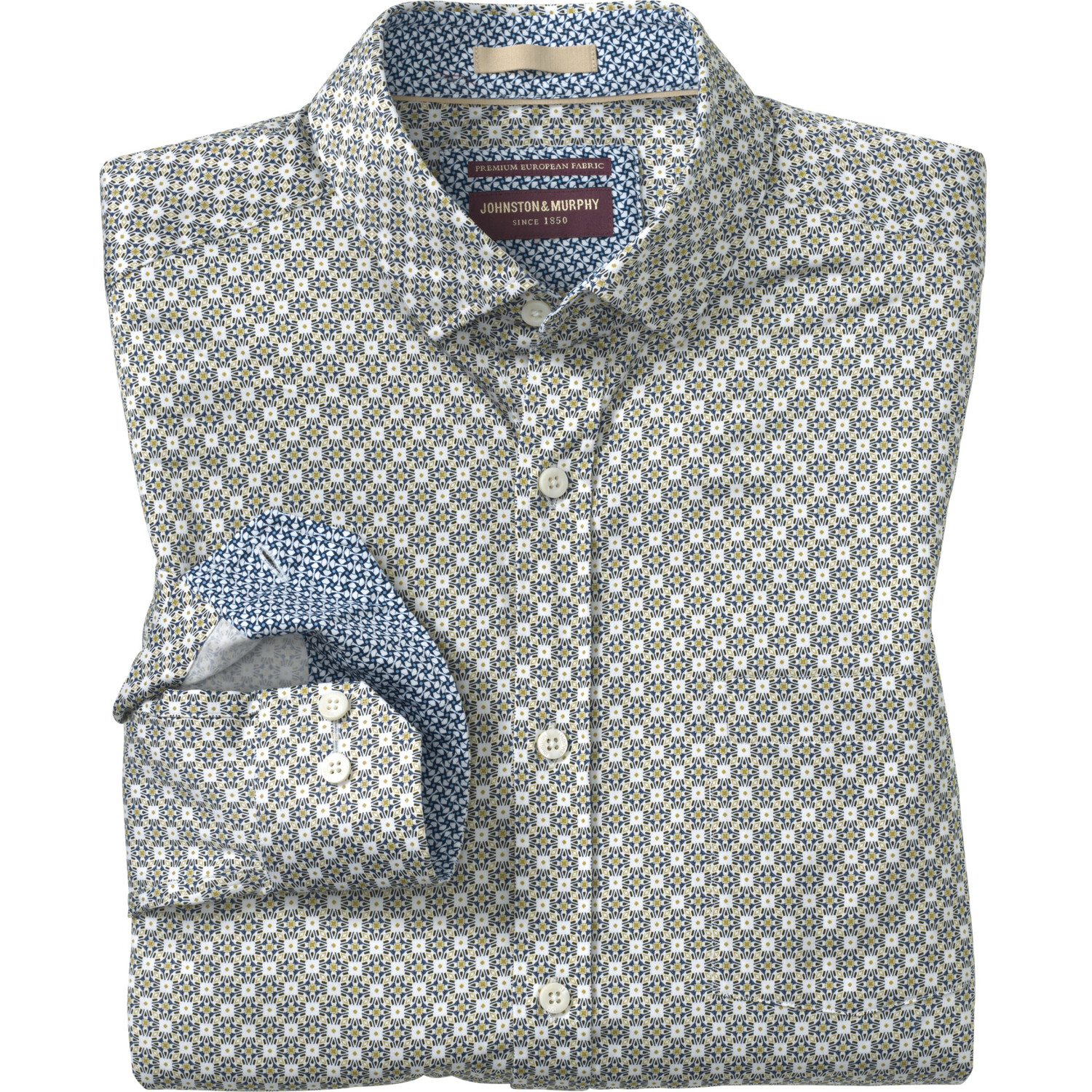 - Sateen finished printed cotton with spandex to add comfort. - Contrast facing inside collar and cuffs. - Hidden button-down collar construction. - Chest pocket. - Shirttail hem. - 97% Cotton/ 3% Spandex. - Machine wash. - Imported.