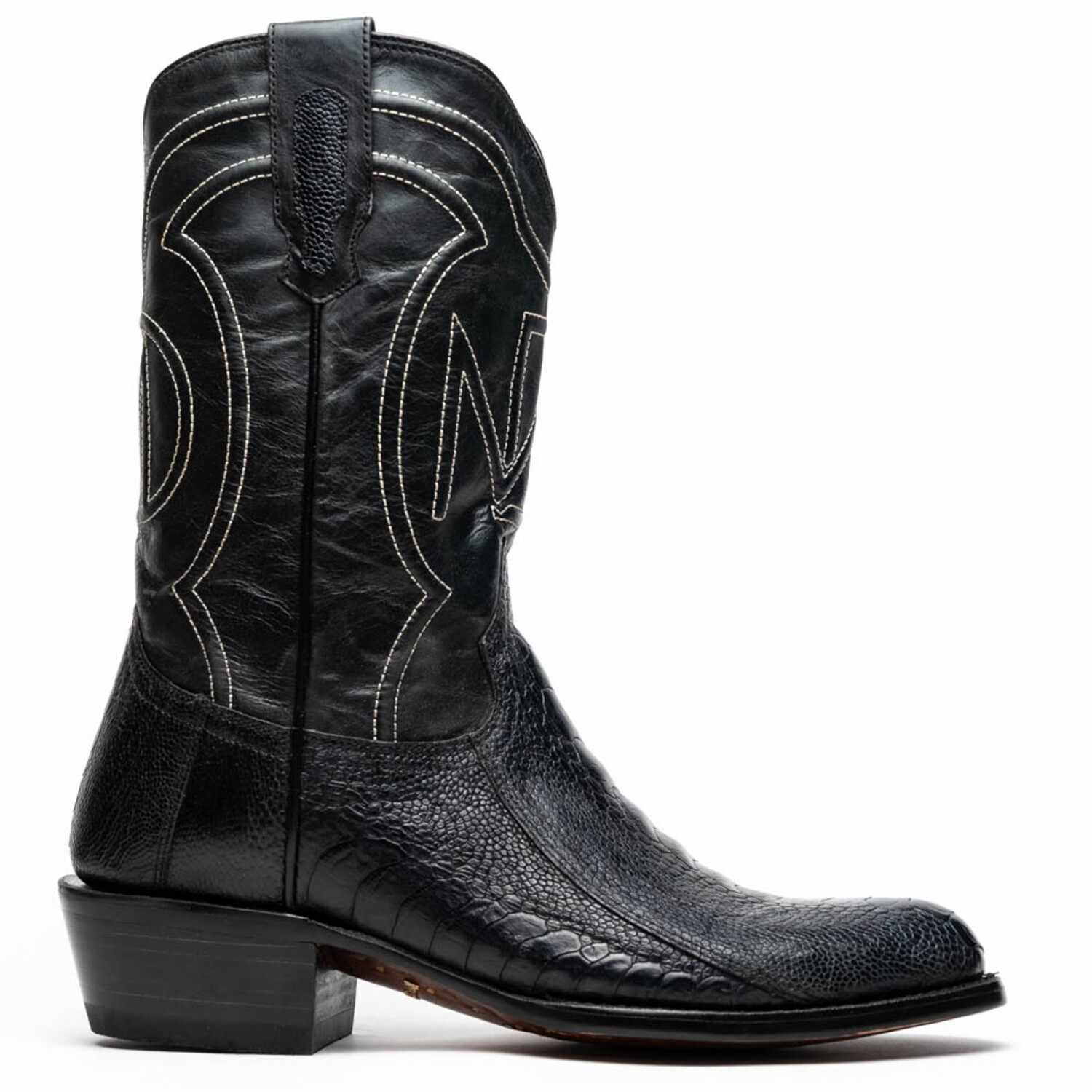 The DENVER boot delivers bold style and exotic elegance with every step. Crafted from genuine ostrich leg skin, this round-toe boot showcases the natural ridges and grain of the leather—rich in detail and unmistakably luxurious. Its deep red vamp is perfectly balanced by a black full-grain leather shaft with matching red stitching and pull tabs, bringing together contrast and craftsmanship in true Western fashion.
