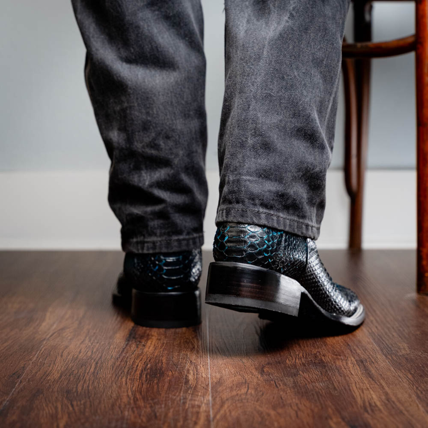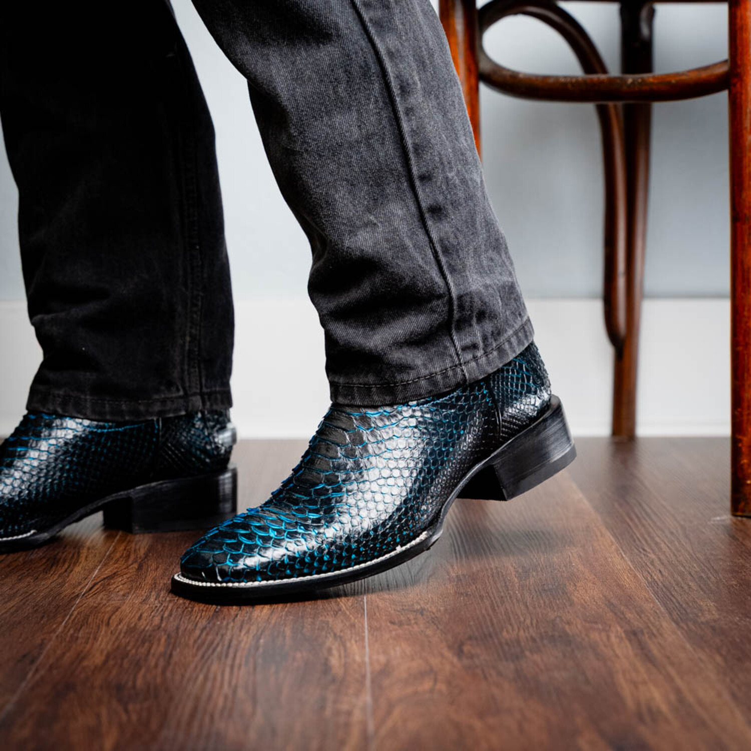 The MISSOURI boot captures the spirit of the West through bold design, master craftsmanship, and premium exotic materials. Handcrafted using genuine Python skin on the vamp and full-grain leather on the shaft, it delivers rich texture and visual contrast. The defining square toe adds a confident, modern twist to the classic cowboy profile, while the signature red leather lining brings a refined interior finish.