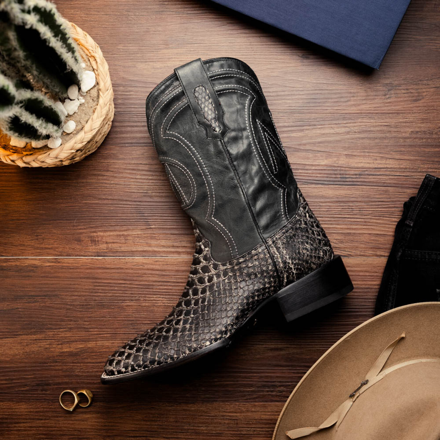 The MISSOURI boot captures the spirit of the West through bold design, master craftsmanship, and premium exotic materials. Handcrafted using genuine Python skin on the vamp and full-grain leather on the shaft, it delivers rich texture and visual contrast. The defining square toe adds a confident, modern twist to the classic cowboy profile, while the signature red leather lining brings a refined interior finish.