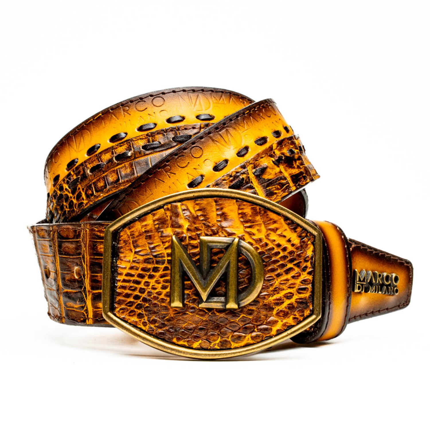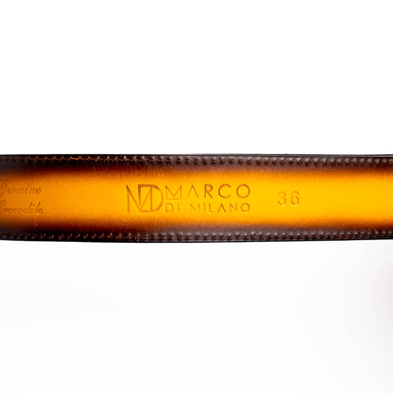 The MONTANA belt channels classic Western spirit through a bold, handcrafted lens. Made from genuine caiman crocodile skin and overlaid with rich full-grain calf leather, it features the distinctive Marco Di Milano brand stamp across the outer panel and a custom center-stitched leather channel—a nod to traditional saddlework that adds both texture and character.