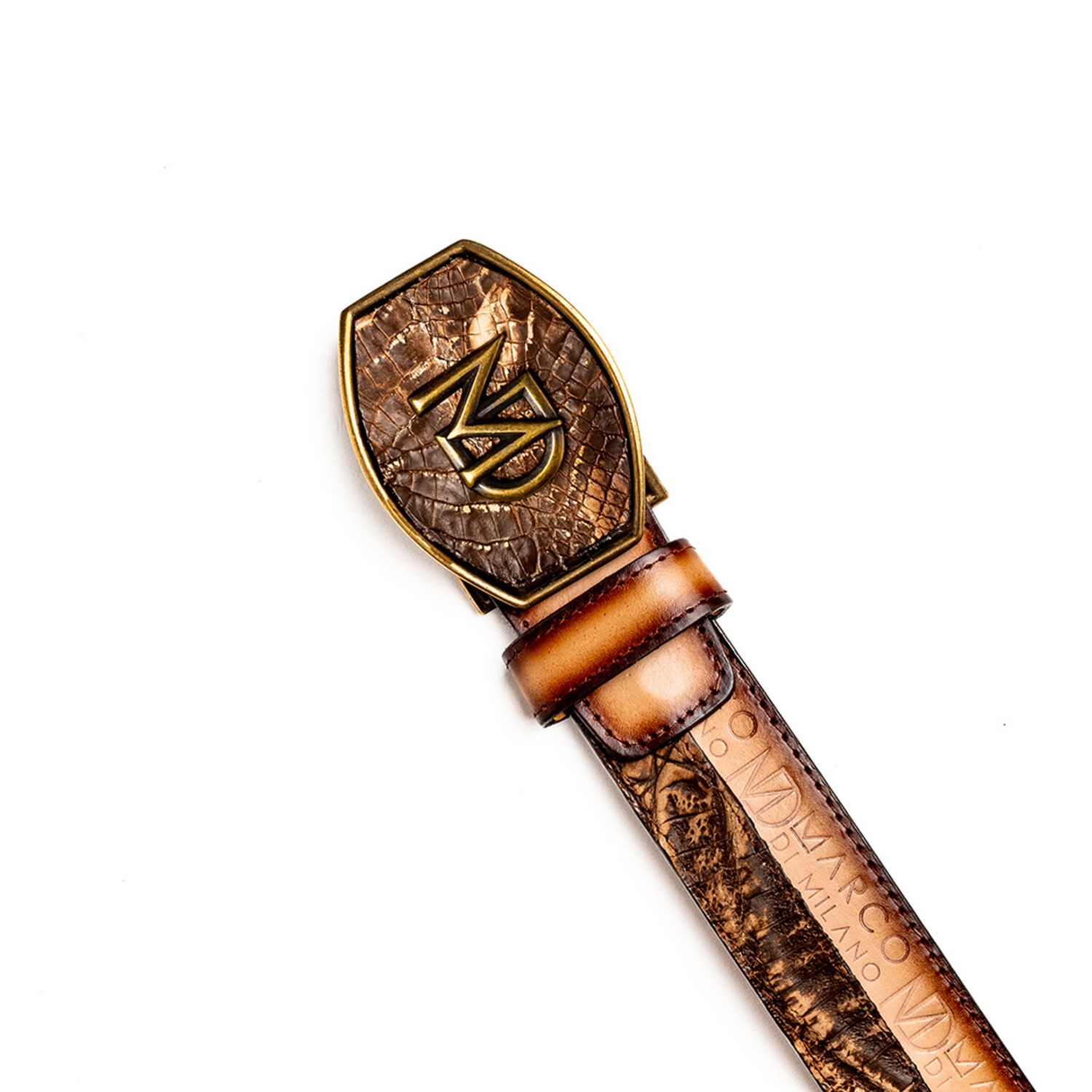 The TEXAS belt is a bold fusion of exotic luxury and branded identity. Handcrafted from genuine caiman crocodile skin and contrasted with premium full-grain calf leather, it delivers a striking interplay of textures. The calf leather front is hot-stamped with the Marco Di Milano insignia, adding depth, dimension, and unmistakable identity to the exterior design.