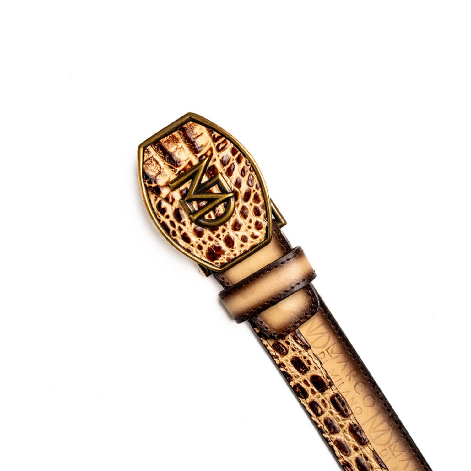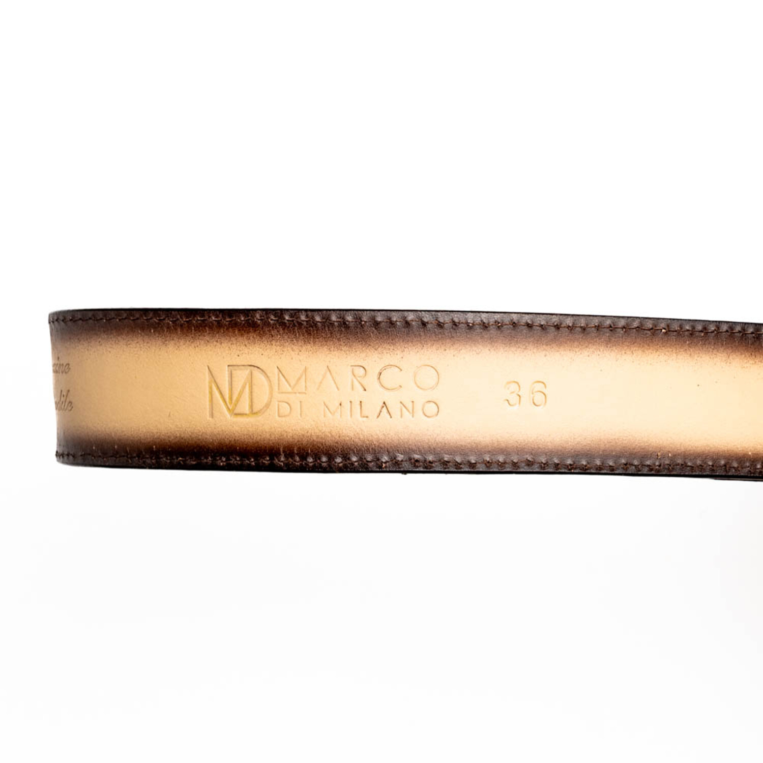 The TEXAS belt is a bold fusion of exotic luxury and branded identity. Handcrafted from genuine caiman crocodile skin and contrasted with premium full-grain calf leather, it delivers a striking interplay of textures. The calf leather front is hot-stamped with the Marco Di Milano insignia, adding depth, dimension, and unmistakable identity to the exterior design.