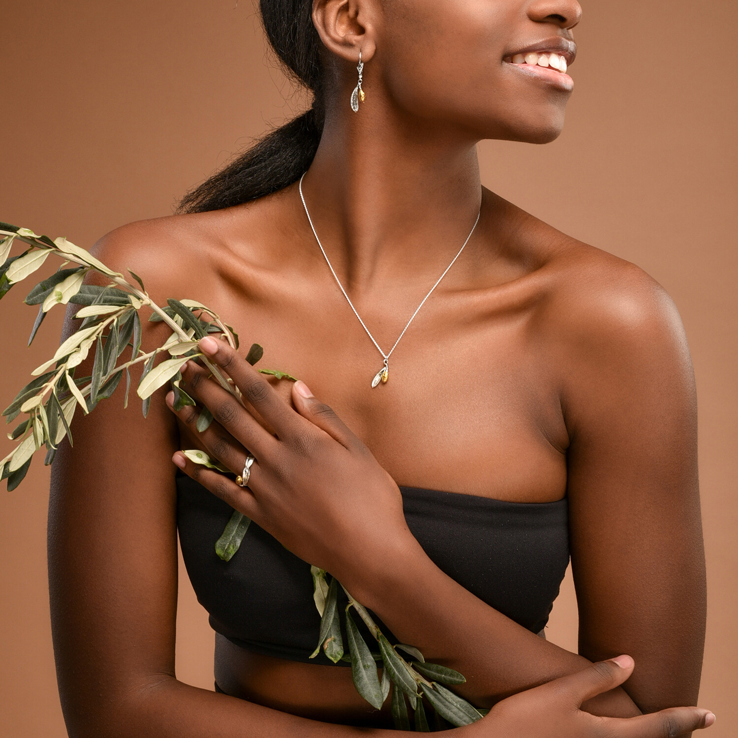 Pendant Sterling Silver Olive Leaf + 14K Gold Filled Plated Olive Fruit Necklace