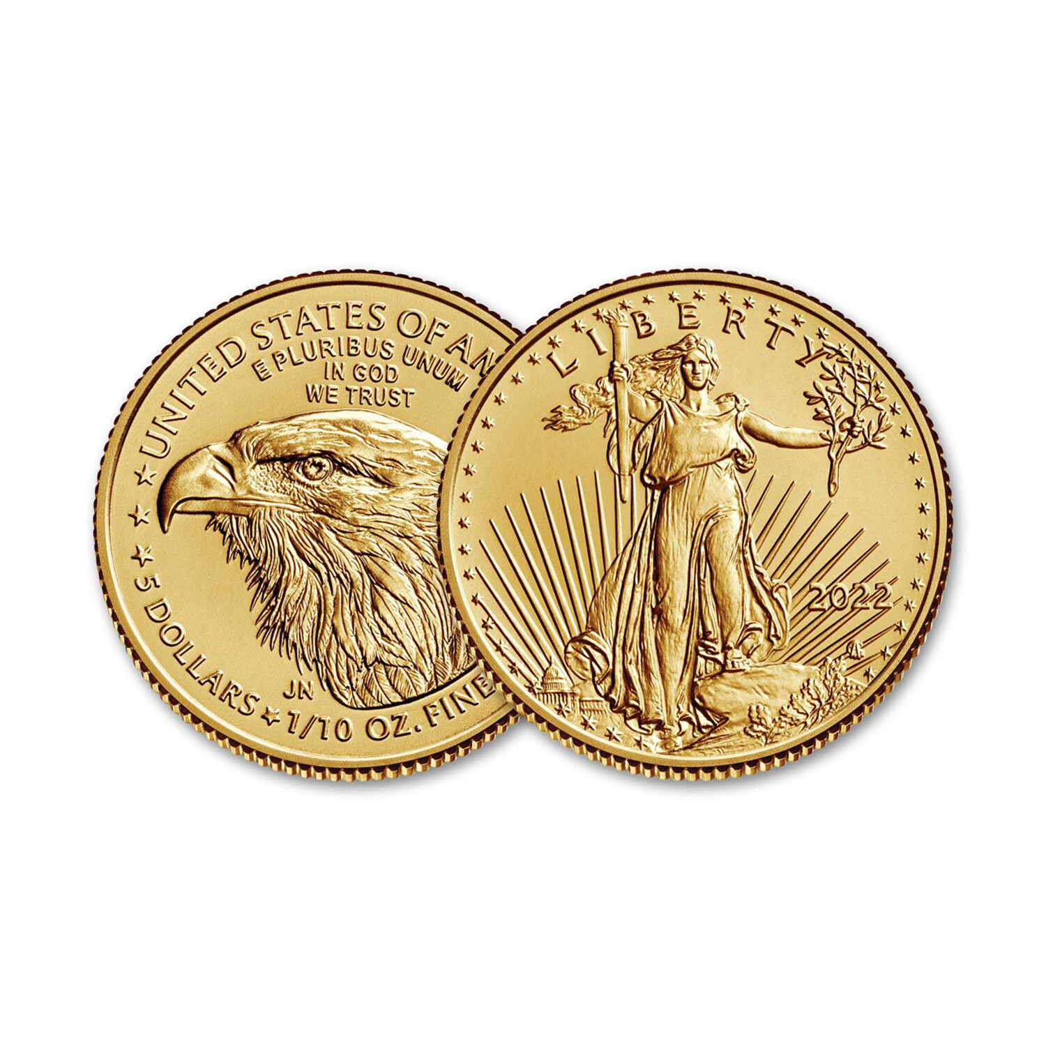 Give the gift of coin collecting with one of the most popular and sought-after gold bullion coins in the world. Offered here is a newly minted 1/10-ounce 2022 American Gold Eagle in uncirculated condition taken straight from fresh U.S. mint rolls. Each coin is housed in an airtight capsule and presented in a luxurious, plush-lined black box with embossed metallic gold lettering and certificate of authenticity. The coins are unconditionally guaranteed to be genuine, minted in 2022, and will match the exceptional mint-state quality of the ones shown.