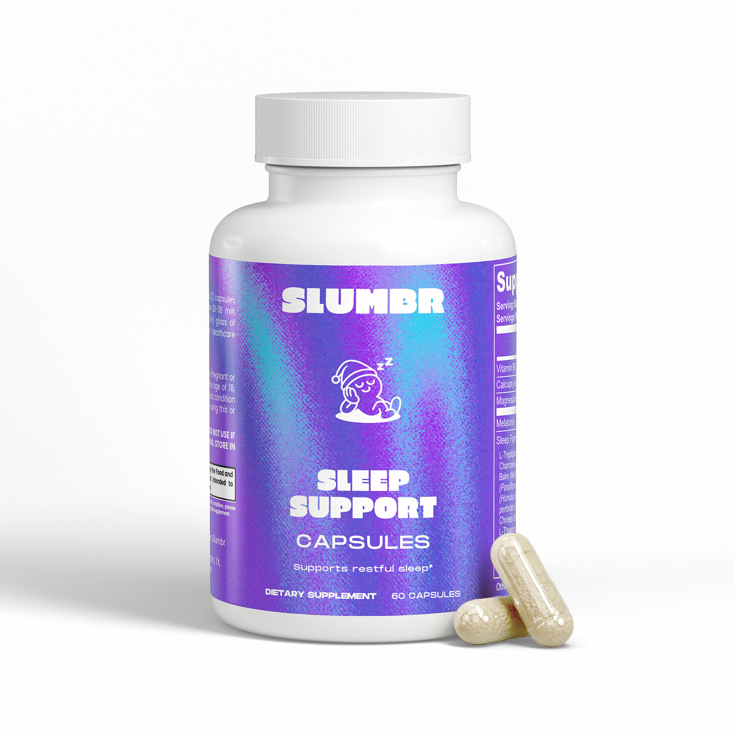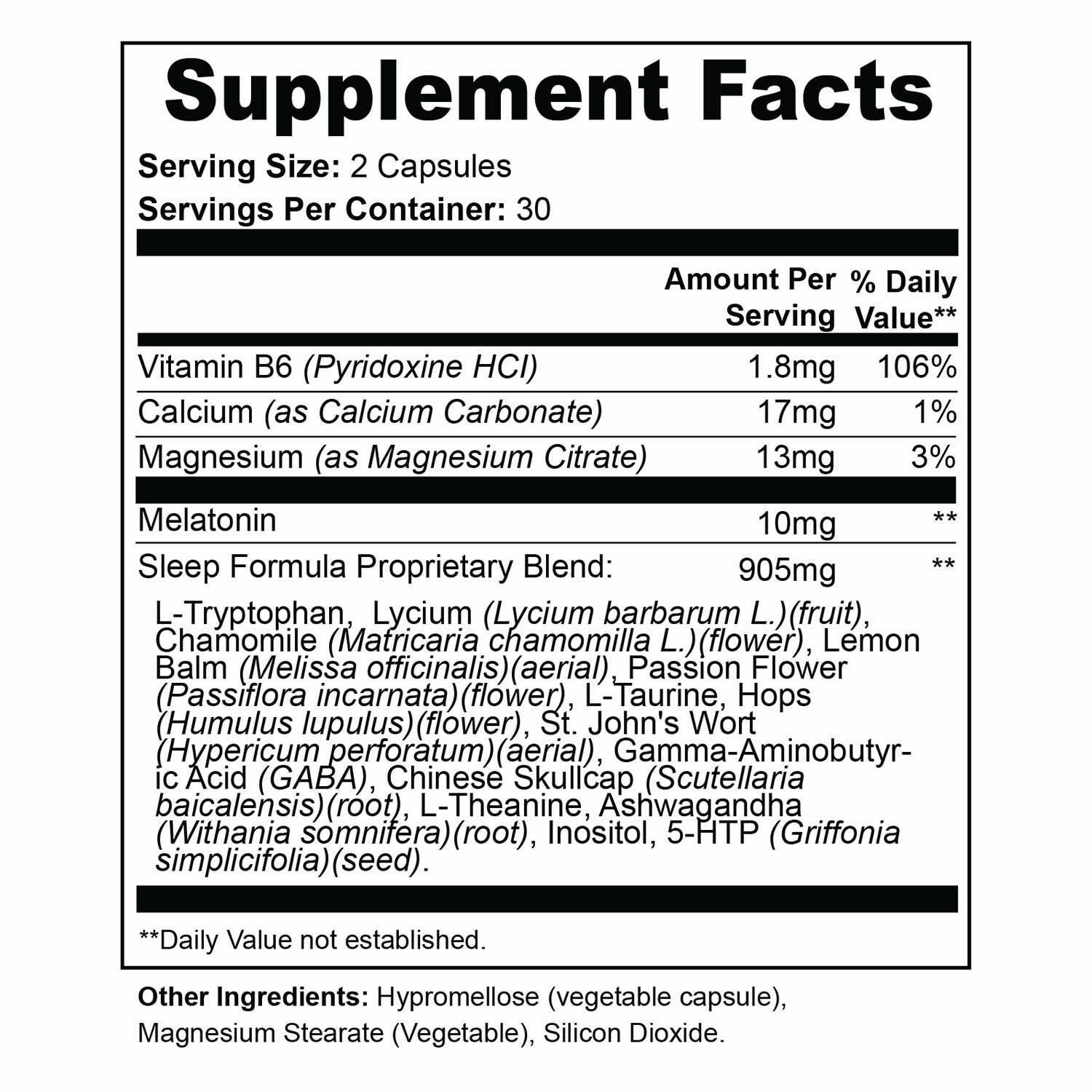— Ingredients: Magnesium Citrate, Pyridoxine HCl Powder (Vitamin B6), Calcium Carbonate, Melatonin, Sleep Formula Proprietary Blend (L-Tryptophan, Lycium (Lycium barbarum L.) (Fruit), Chamomile (Matricaria chamomilla L.) (Flower), Lemon Balm (Melissa officinalis) (Aerial), Passion Flower (Passiflora incarnata) (Flower), L-Taurine, Hops (Humulus lupulus) (Flower), St. John’s Wort (Hypericum perforatum) (Aerial), Gamma-Aminobutyric Acid (GABA), Chinese Skullcap (Scutellaria baicalensis) (Root), L-Theanine, Ashwagandha (Withania somnifera) (Root), Inositol, 5-HTP (Griffonia simplicifolia) (Seed)), Hypromellose (Vegetable Capsule), Silicon Dioxide (Sipernat 22), Magnesium Stearate