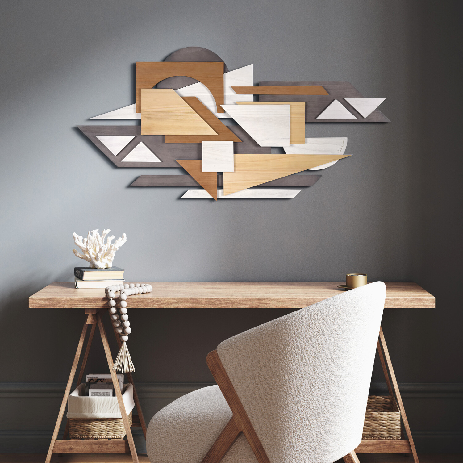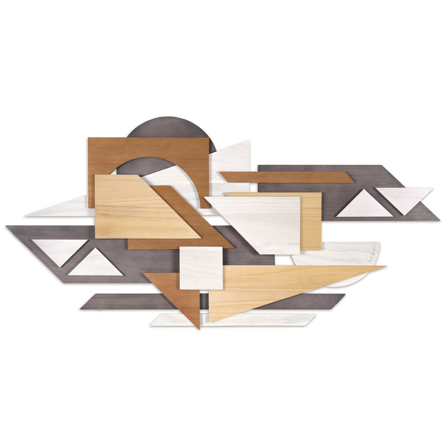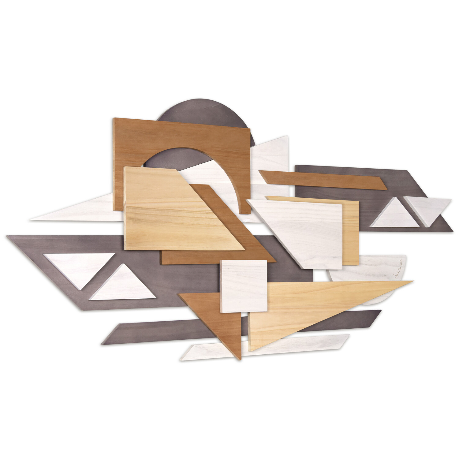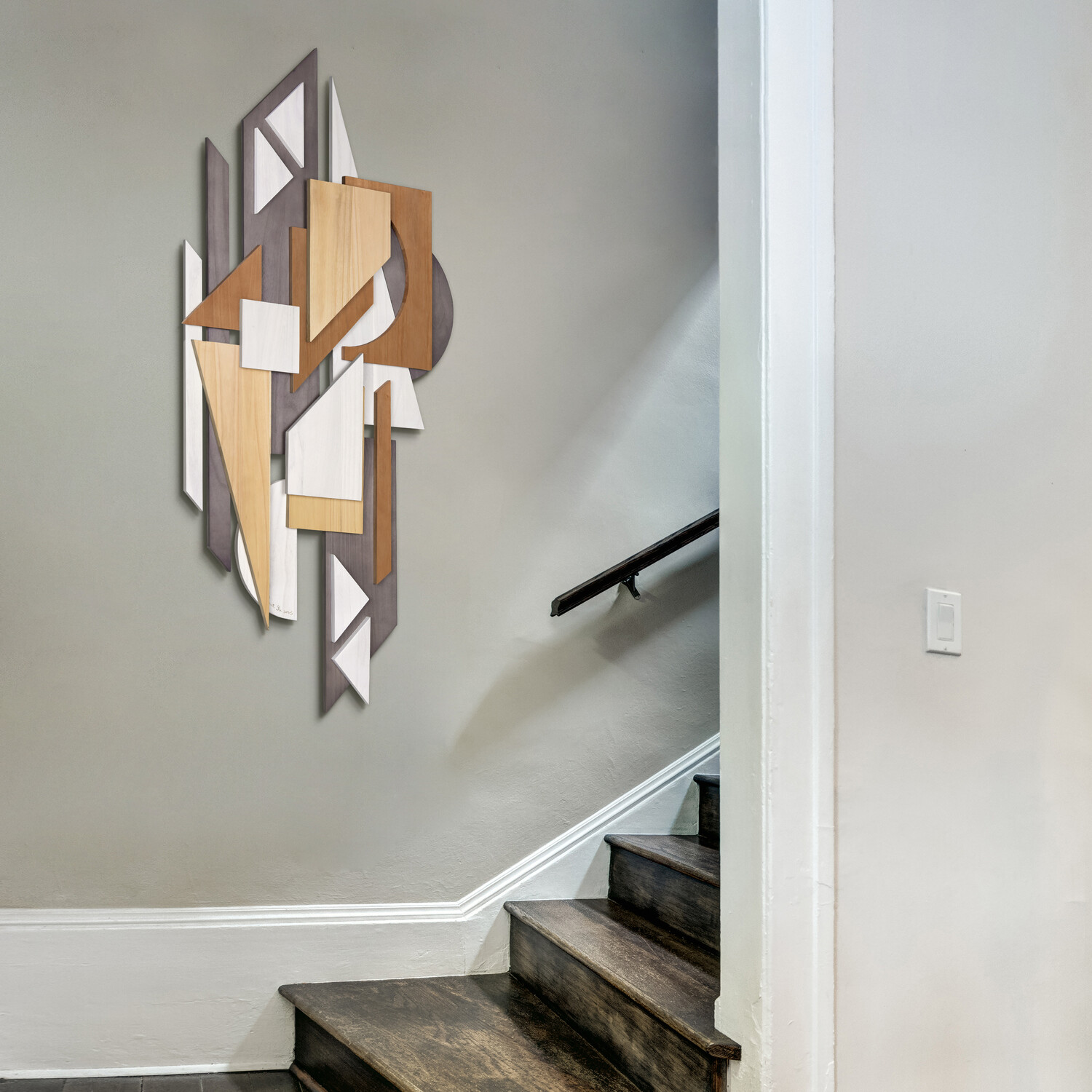 Moonlit Mist I – Abstract Paulownia Wood Wall Sculpture by Jane Yu is a refined blend of structure and movement, featuring intricately arranged pointed wood shapes that suggest the flight of an arrow. Crafted from solid paulownia wood, the piece combines sandy taupe, alabaster, natural wood, and smoky gray tones to create contrast and dimensional depth.