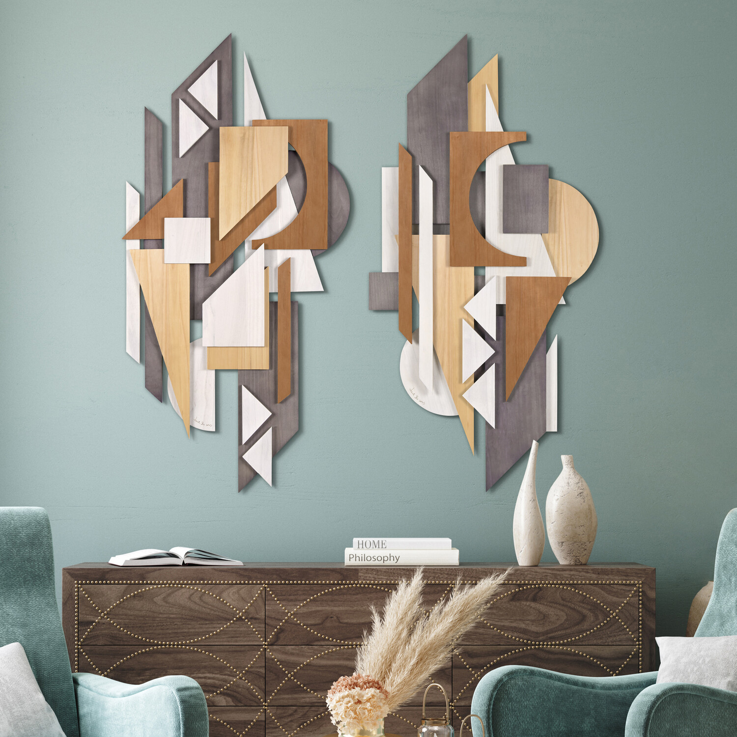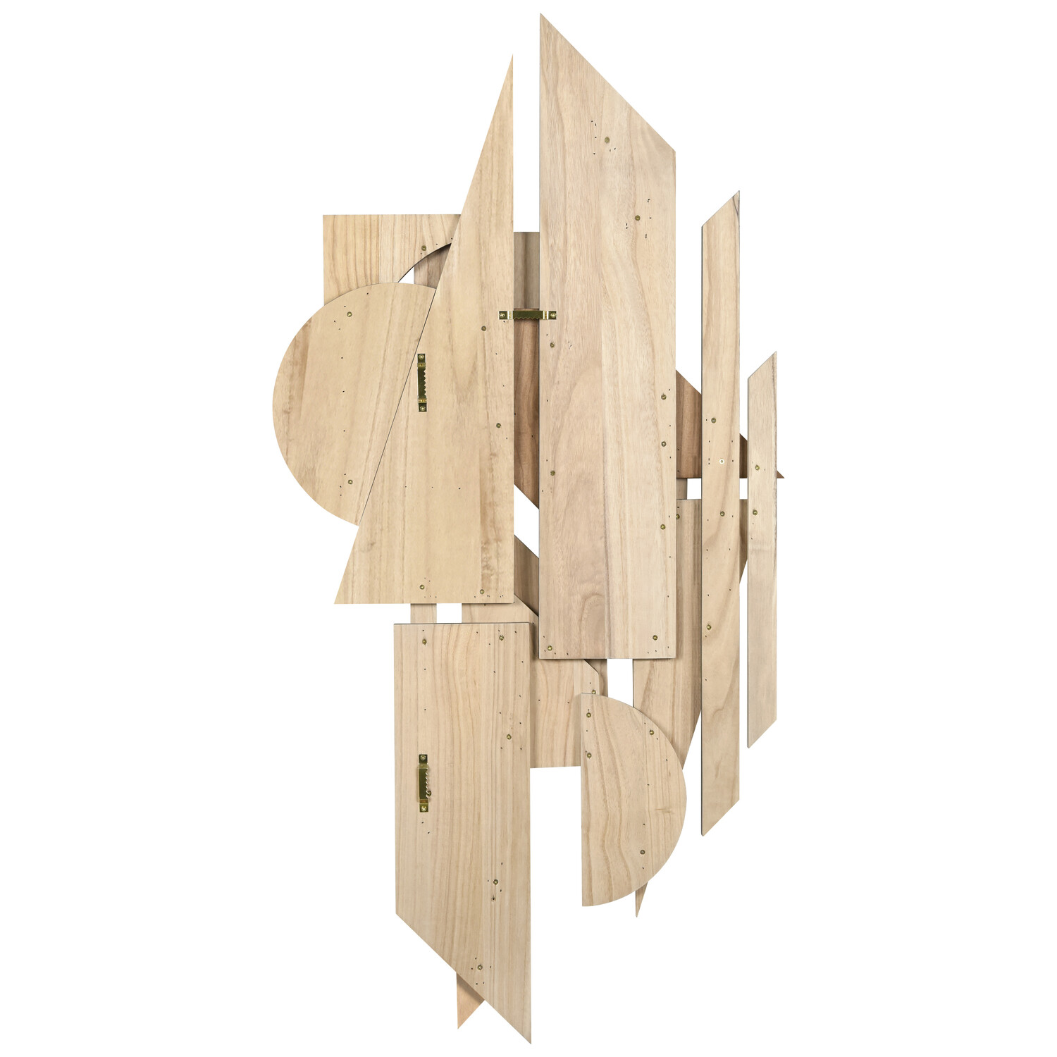 Abstract Paulownia Wood Diptych Wall Sculpture Set by Jane Yu features a striking blend of form and motion, crafted from uniquely shaped pieces of solid paulownia wood. Predominantly pointed forms create the illusion of movement—like an arrow in flight—while a palette of sandy taupe, alabaster, natural wood, and smoky gray adds visual depth and texture.