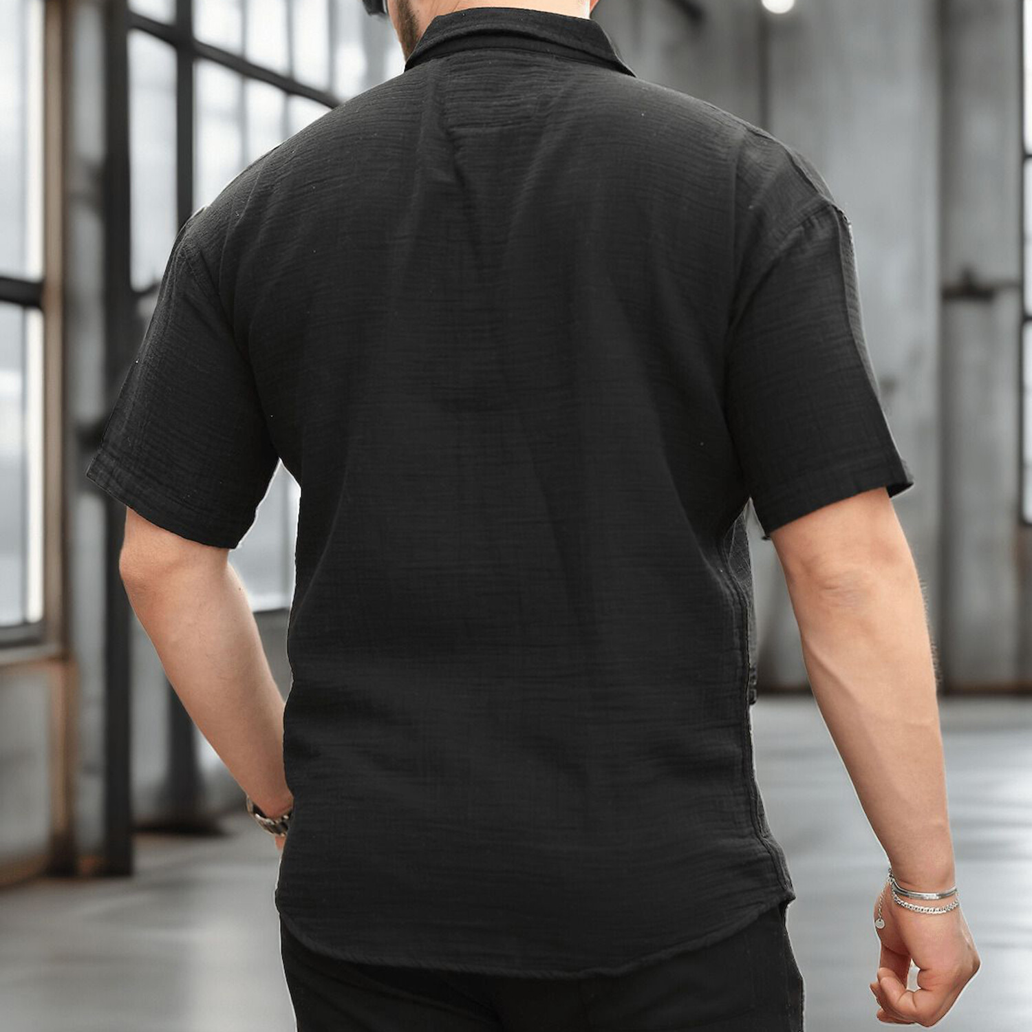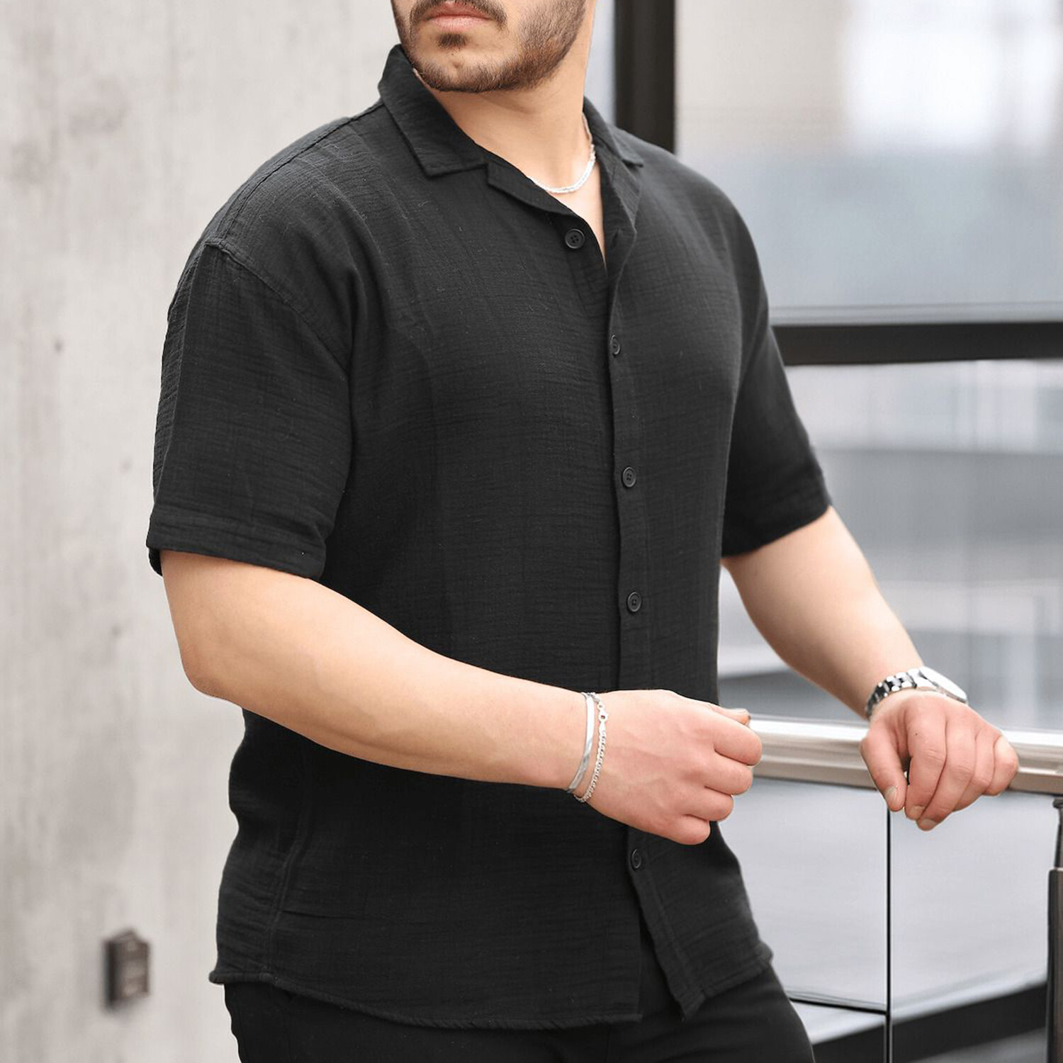 Open Collar Short-Sleeve Button-Up Shirt // Black